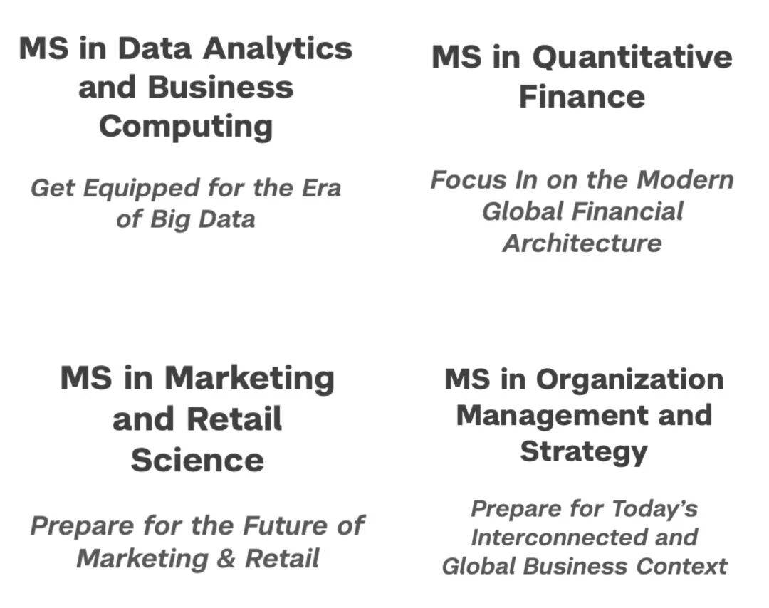 毕业生将被授予世界知名学府——美国纽约大学的理学硕士学位。四个商科硕士项目均采用纽约大学斯特恩商学院的顶尖课程体系,集合纽约大学斯特恩商学院和上海纽约大学优秀的师资力量,聚焦中国和亚洲市场,致力于培养学生成为具备全球视野、本地洞察与创新能力的商业精英。