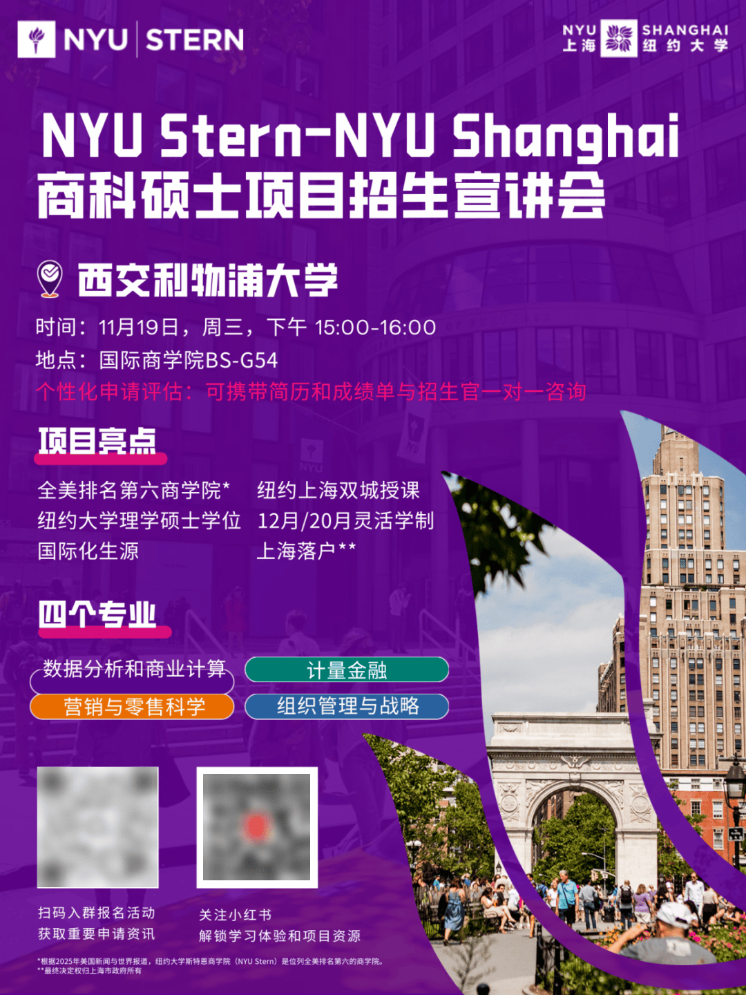 本次活动面向西浦学生,包含纽约大学斯特恩商学院(NYU Stern)和上海纽约大学(NYU Shanghai)联合开设的商科理学硕士项目讲座,涵盖四个不同方向的商科硕士项目:数据分析和商业计算、计量金融、营销与零售科学、组织管理与战略,致力于培养目标在中国及亚洲地区开创职业生涯的未来商业精英。