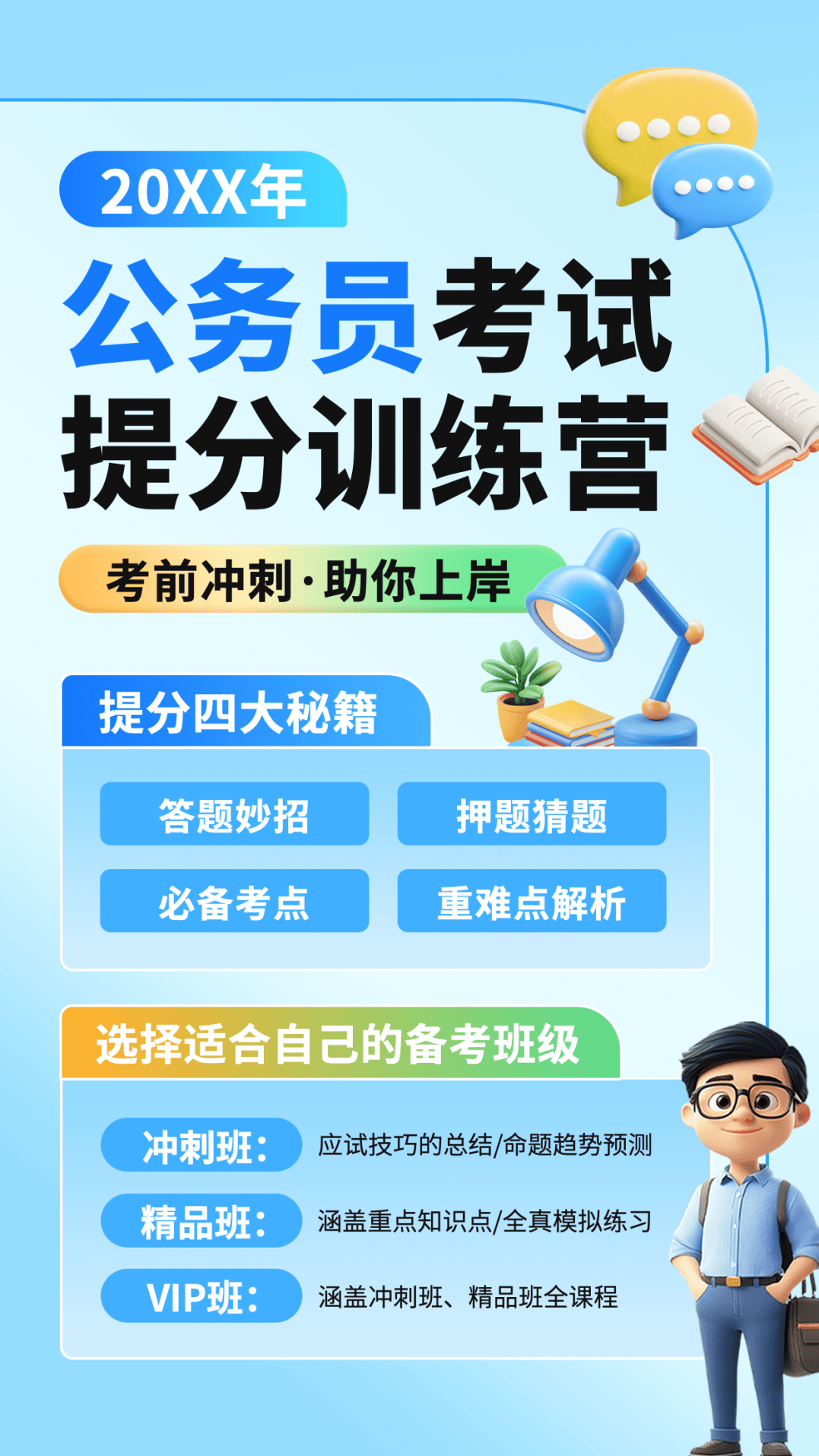 这组国考省考培训班海报模板,用清新配色与卡通元素结合,突出提分训练的实用性与针对性,展现提分训练的高效性,吸引考生选择适合自己的备考班级。