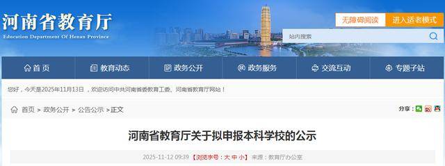 11月13日,记者从河南省教育厅获悉,河南拟申报3所本科学校并予以公示。