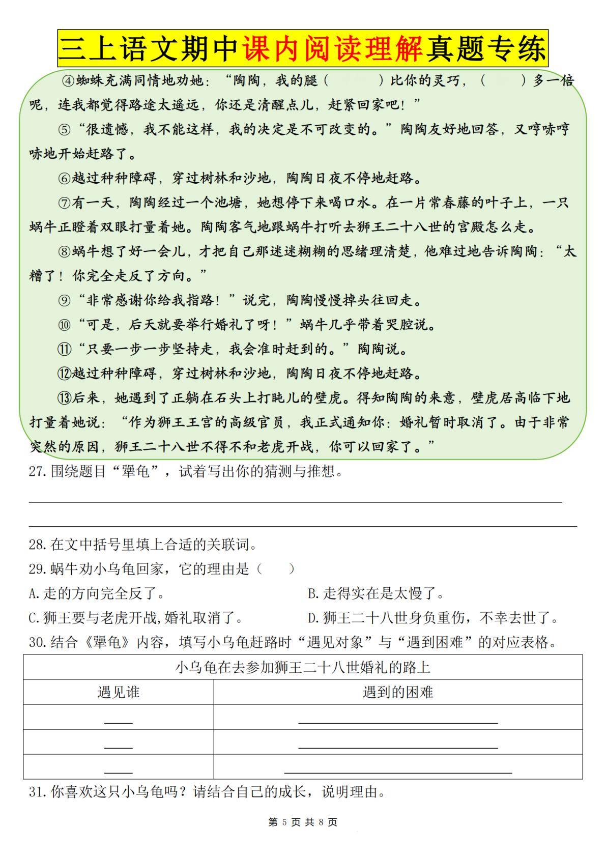 期中复习的专项突破工具、日常阅读能力的强化训练资料,还是语文素养的提升素材,这份资料都能为三年级学生提供 “从文本到考点、从知识到能力” 的学习路径,助力其在期中课内阅读理解板块实现成绩与能力的双重提升。