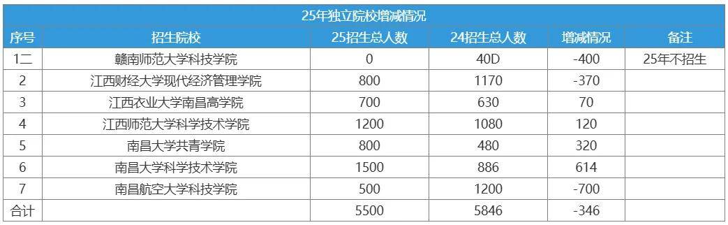 其他独立院校如南昌大学科学技术学院、南昌大学共青学院等虽有扩招,但整体独立院校招生人数较2024年减少346人。