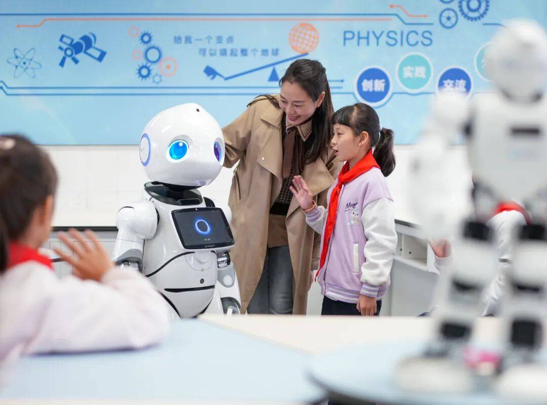 江苏省泰州市姜堰区淮海小学学生与智能机器人互动。周社根 摄