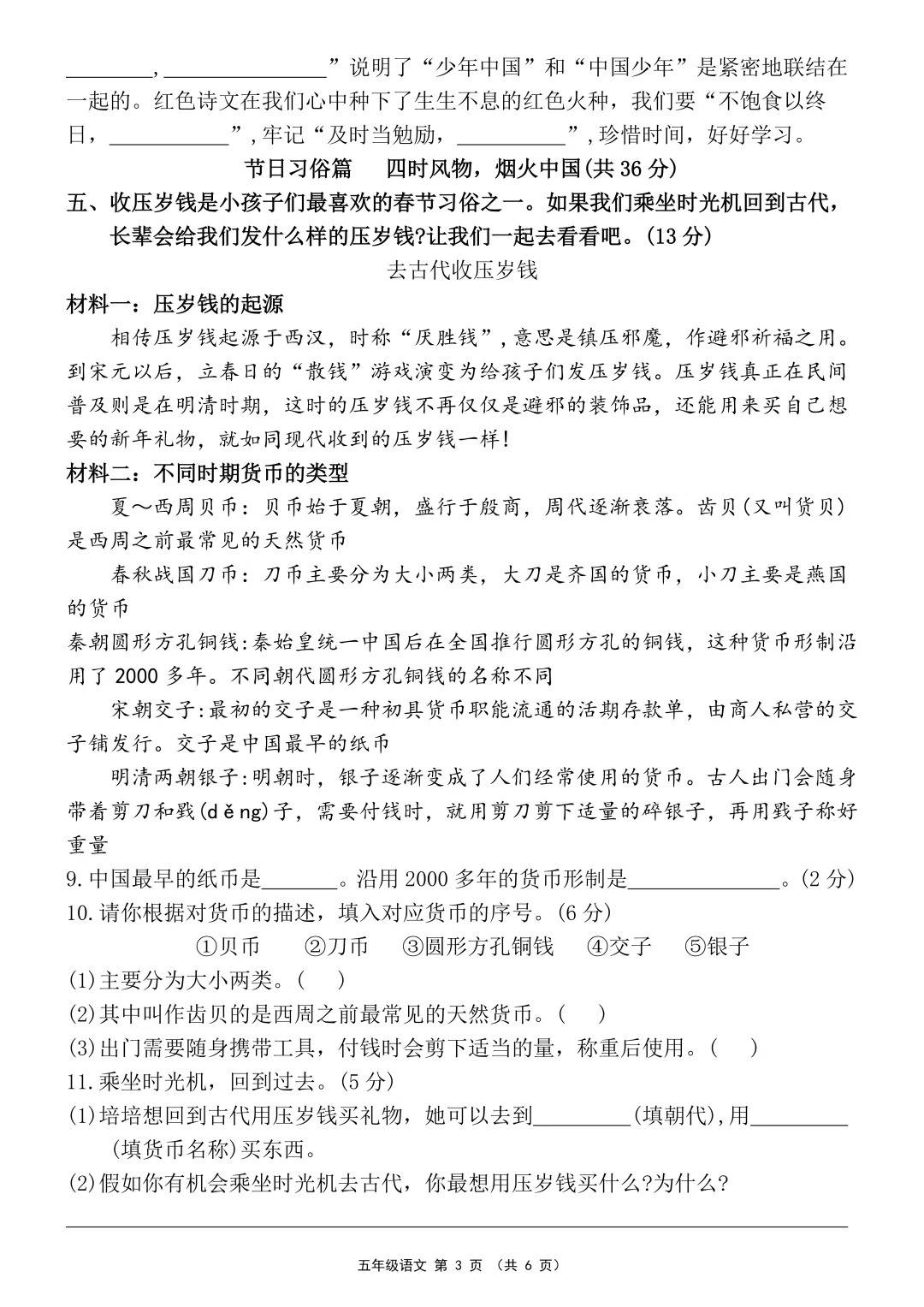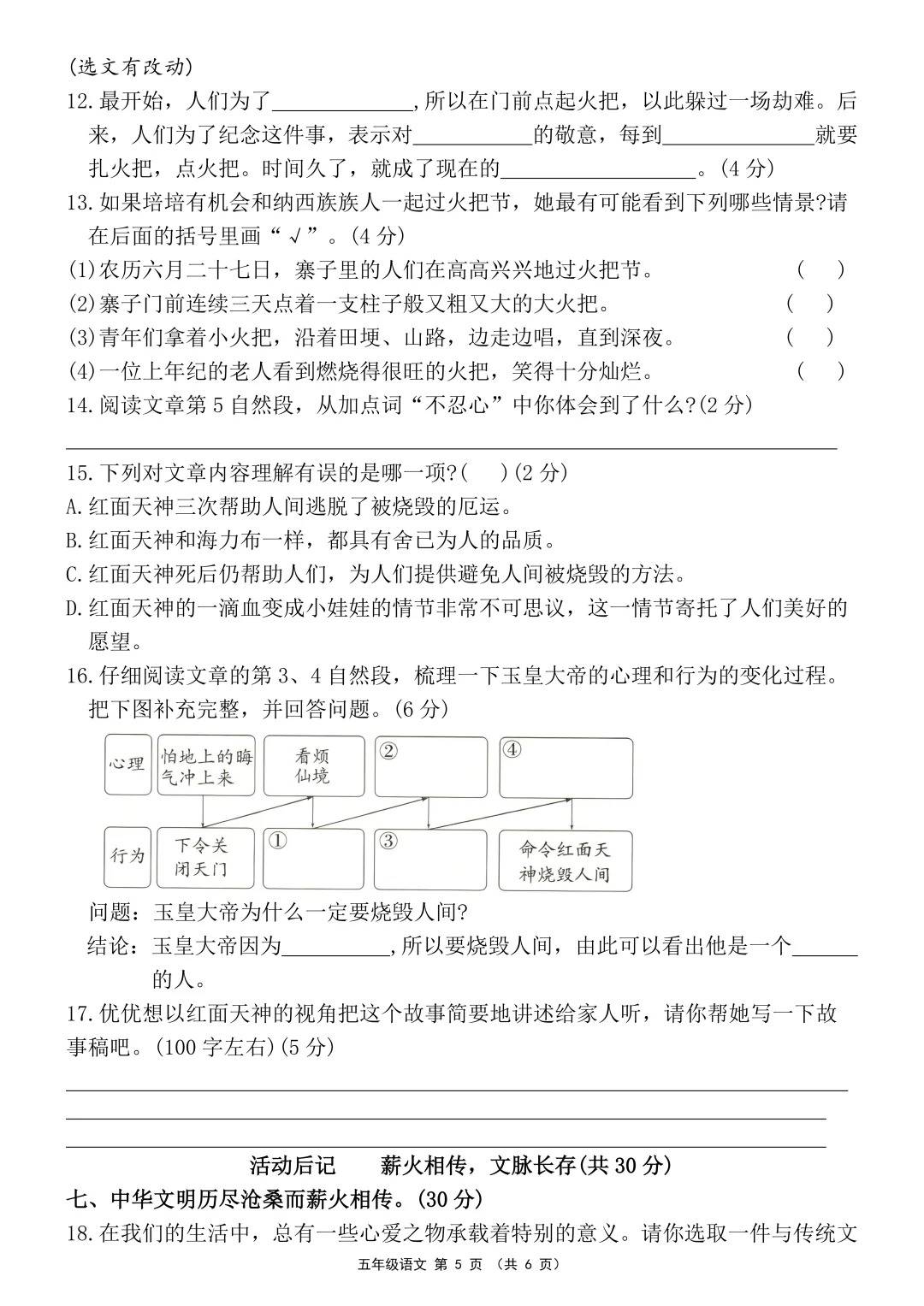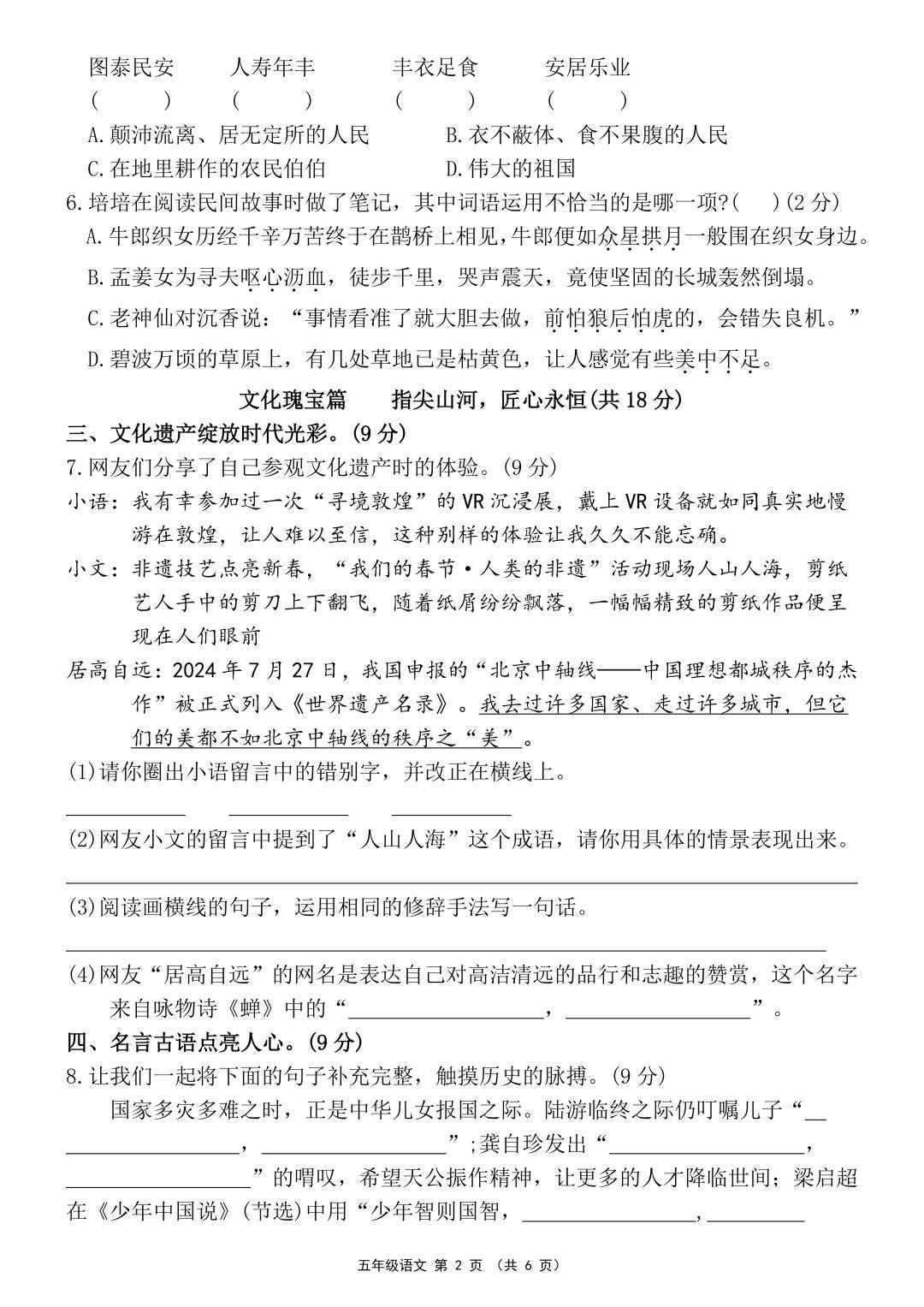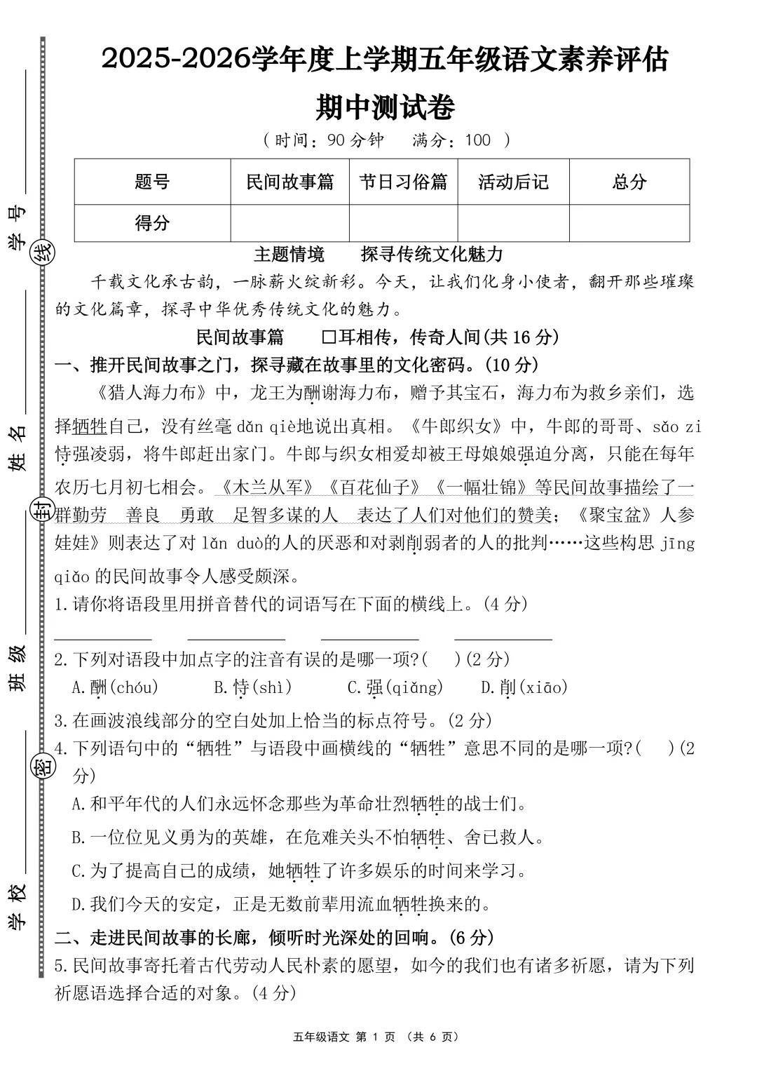 这份2025-2026 学年度上学期五年级语文期中测试卷,以 “探寻传统文化魅力” 为主题情境,围绕民间故事、文化遗产、节日习俗等核心板块全面考查知识掌握与应用能力,助力五年级学生检测期中语文知识漏洞,提升传统文化理解、文本解读与写作表达能力。