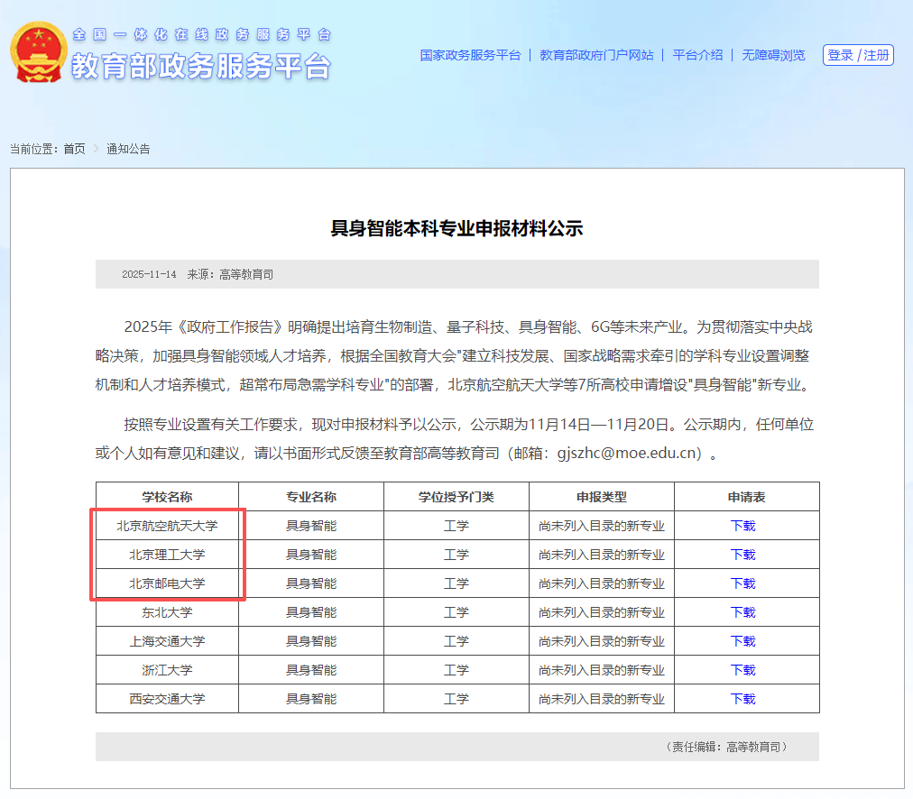 11月14日,教育部政务服务平台公示了7所联合申报增设“具身智能”本科专业的双一流高校。北京有三所理工强校同时入围,分别为北京航空航天大学、北京理工大学和北京邮电大学