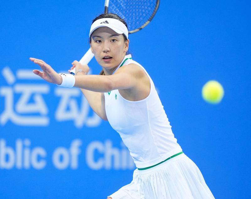 11月18日,广东队选手王欣瑜在比赛中回球。当日,在广东横琴举行的第十五届全国运动会网球项目女子单打四分之一决赛中,广东