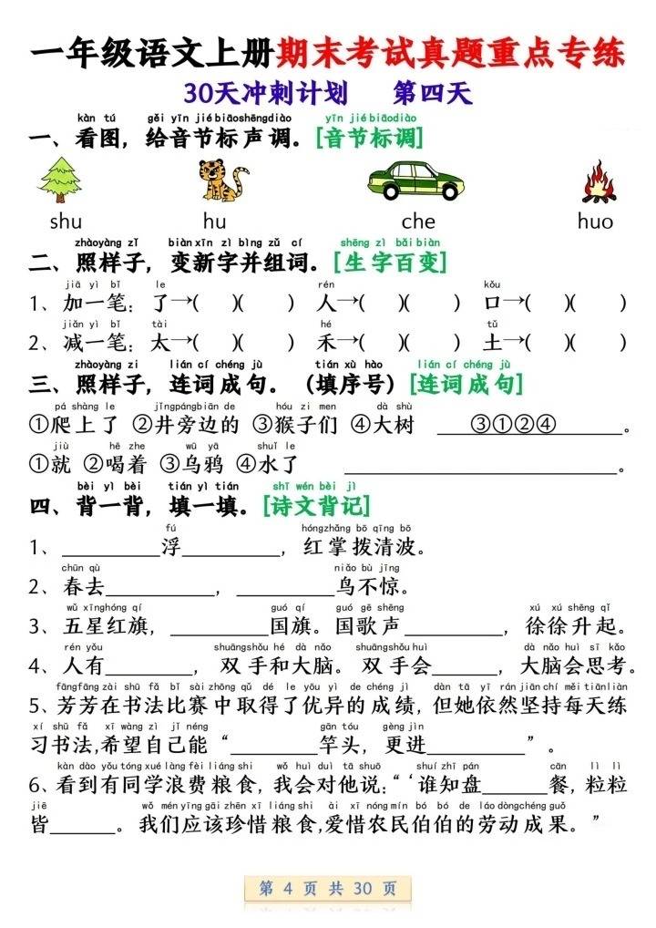 这份一年级语文上册期末考试真题重点专练 30 天冲刺计划,围绕期末核心考点分日设计训练,涵盖汉语拼音(声母、音节、标调)、字词基础(看拼音写词语、字形、易错字音)、课内知识(课文内容连线、填空)、古诗文背记、基础能力(笔画笔顺、反义词、词语搭配、句子训练)等模块,助力一年级学生系统巩固语文基础,高效备战期末考。
