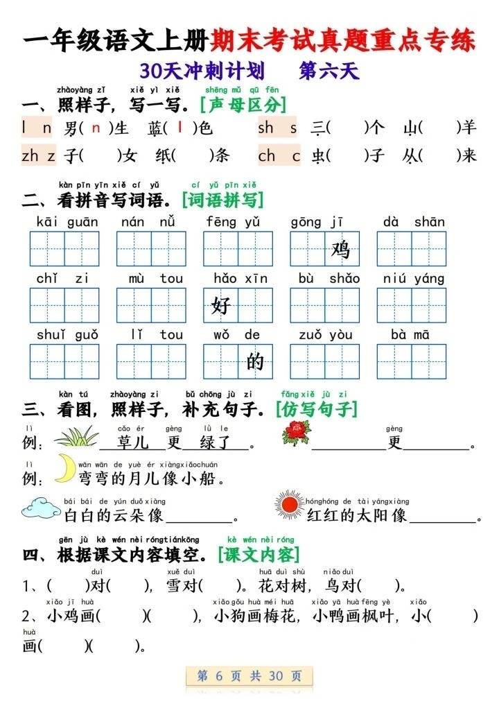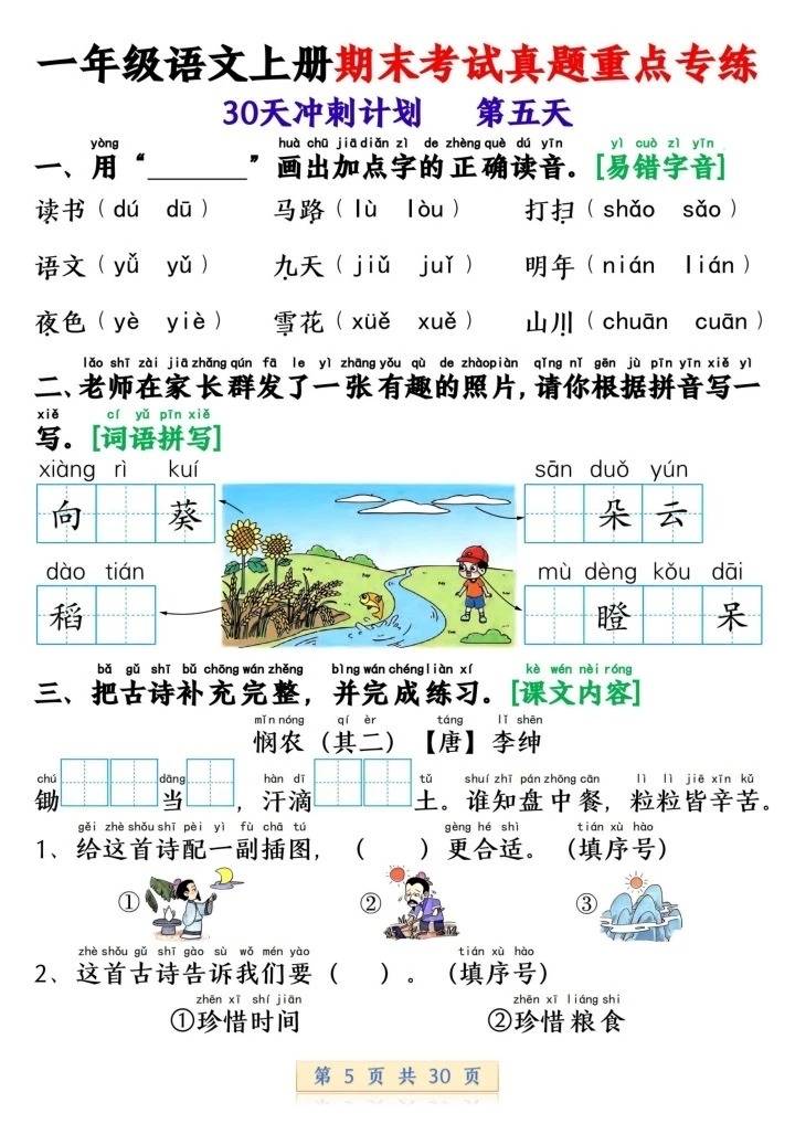 对学习的帮助意义显著:30 天分模块推进的节奏贴合一年级认知特点,训练紧扣期末高频考点,让复习更具计划性,解决 “期末复习无条理、基础知识点漏洞多” 的问题;从拼音字词到课文内容再到句子训练层层递进,助力学生从 “机械记诵” 转向 “理解性运用与能力提升”;覆盖 “一年级语文上册期末真题 30 天冲刺”“汉语拼音考点”“看拼音写词语难点”“课文内容填空重点” 等高频需求点,是 “语文基础夯实”“期末考点专项突破”“基础能力提升” 的有力支撑,让一年级语文学习从 “零散积累” 转向 “系统整合与素养内化”。