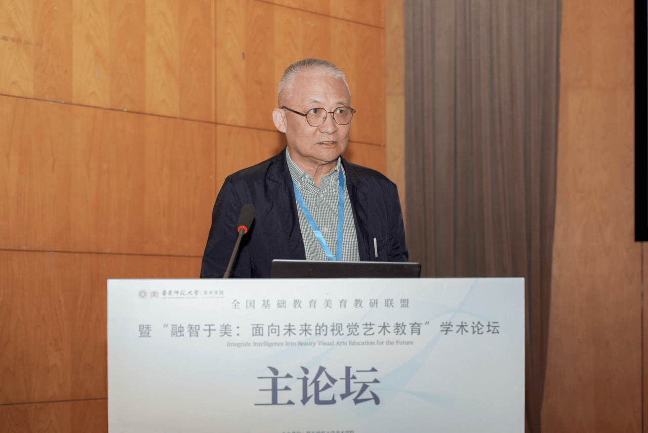 杜卫、丁钢、孔新苗、周春花、钱初熹五位专家先后发表主旨演讲,从不同维度深入阐释了智能时代视觉艺术教育的核心议题。主论坛由华东师范大学美术教育系主任毛毅静主持。