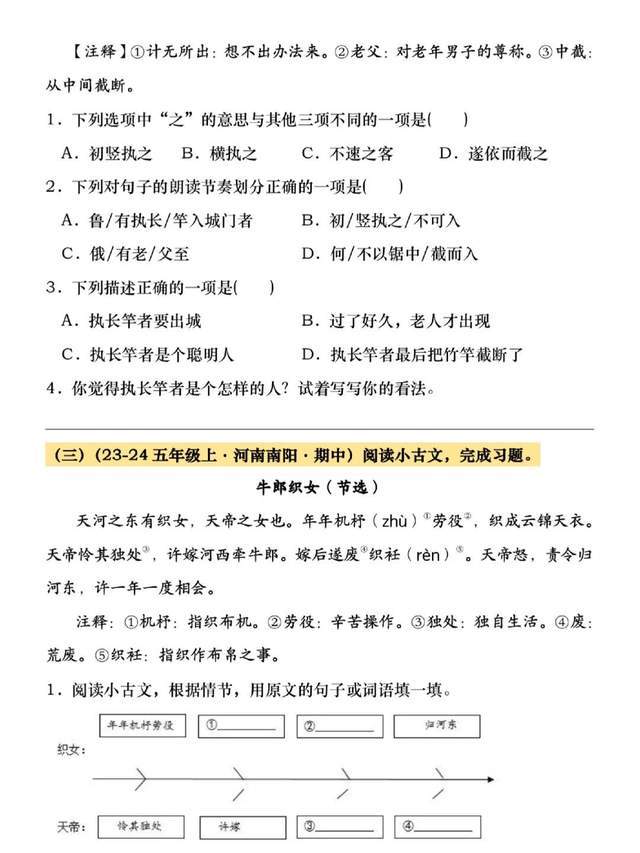 里面全是各地期中真题:既有《少年中国说》这种课内经典节选,也有《张丞相好草书》《叶公好龙》《司马光好学》等课外文言,甚至还有《牛郎织女》小古文版 vs 民间故事的对比阅读!每篇都配了字词解释、句子翻译、内容理解,连 “之” 的用法辨析、朗读节奏划分这种考点都挖得透透的~对五年级学生来说,这份资料简直是文言能力升级的 “王牌辅助”: 精准匹配五年级文言学习节奏:五年级是文言阅读从 “浅尝” 到 “深读” 的关键期,这份资料既覆盖课内必背的《少年中国说》,又拓展了《叶公好龙》《截竿入城》等经典文言,刚好契合教材 “课内 + 课外” 的文言要求;像《司马光好学》里 “倍诵”(通 “背诵”)的通假字、《张丞相好草书》里 “工”(工整)的字义,都是五年级需要积累的文言基础点。