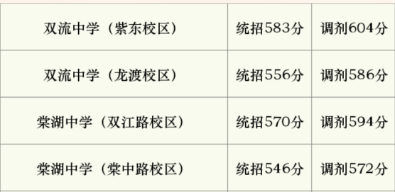 区内公办高中里,双流中学(紫东校区)统招线最高,达到583分;棠湖中学(双江路校区)紧随其后,570分。这两个校区也面向“5+2”区域少量招生,统招分数线比区内还高,都是591分。