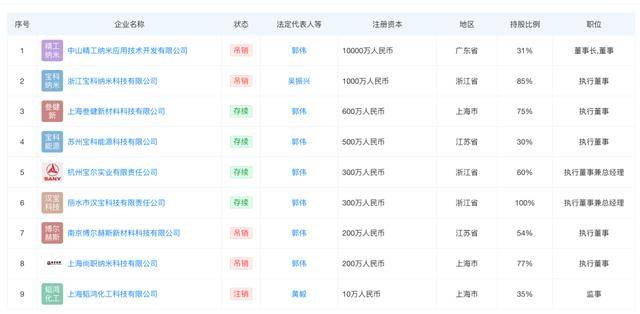 事实上,企业信用信息公示系统显示,郭某是7家企业的法定代表人,其中3家公司已吊销,包括中山精工纳米应用技术开发有限公司、南京博尔赫斯新材料科技有限公司、上海尚职纳米科技有限公司,还有4家公司存续,分别是丽水市汉宝科技有限责任公司、上海叁健新材料科技有限公司、苏州宝科能源科技有限公司、杭州宝尔实业有限责任公司。