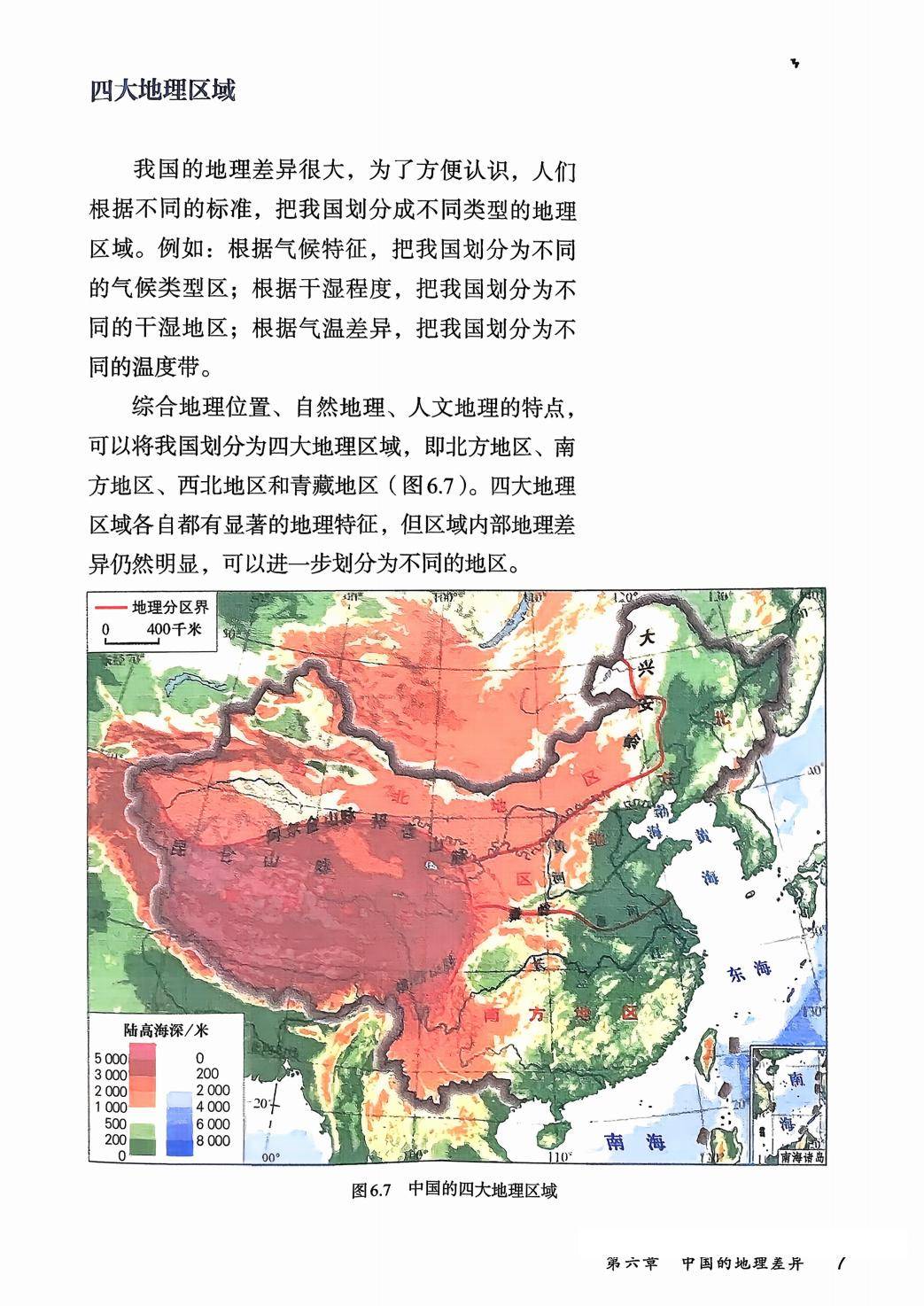 以中国地理区域为核心,从地理差异到四大地理区域(北方、南方、西北、青藏),再到国家发展成就,形成完整的中国地理学习逻辑,让学生清晰把握中国地理的研究脉络,构建起对中国不同区域地理状况的整体认知。例如在 “中国的地理差异” 中,学生能学习分析地理差异的方法,为认识具体区域奠定基础。丰富的区域案例涵盖中国各大地理区域的典型地区,涉及自然环境、人文经济、区域发展等方面,拓宽学生的地理视野,让学生知晓中国各地的地理差异和发展特色。地图、问题思考和跨学科活动的设置,如分析中国地势三级阶梯与气候的关系、探讨秦岭 — 淮河以北的生活文化特点、研究二十四节气的地理意义,能让学生将所学知识应用于实践,提升自主探究能力、地理思维能力和跨学科综合素养。对中国地理全貌的呈现,培养了学生的家国情怀和地域认知,让学生理解地理知识在认识祖国、热爱祖国中的应用价值。