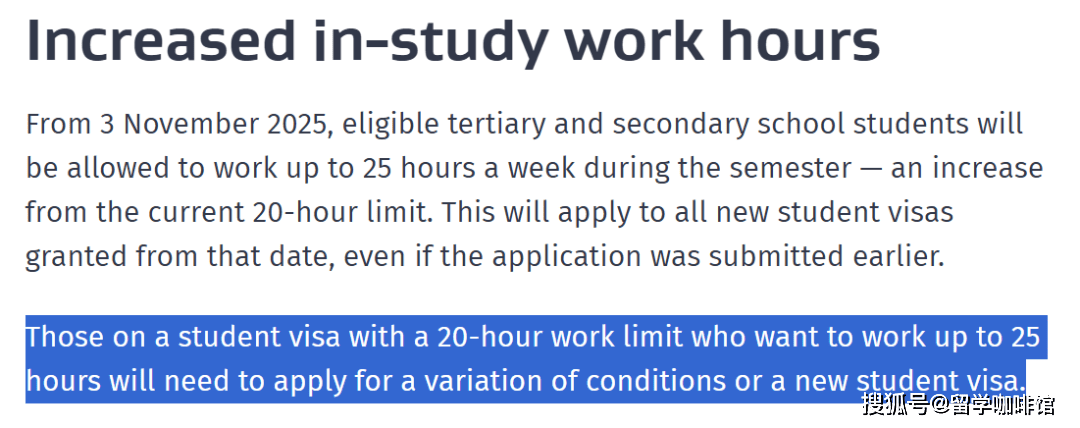 而对于学生签证上仍写着“每周 20 小时”工作上限的在读学生,若想要在学期内工作至每周 25 小时,须申请变更签证条件或递交新签证。允许学生在规定假期期间全职工作的既有规定保持不变。