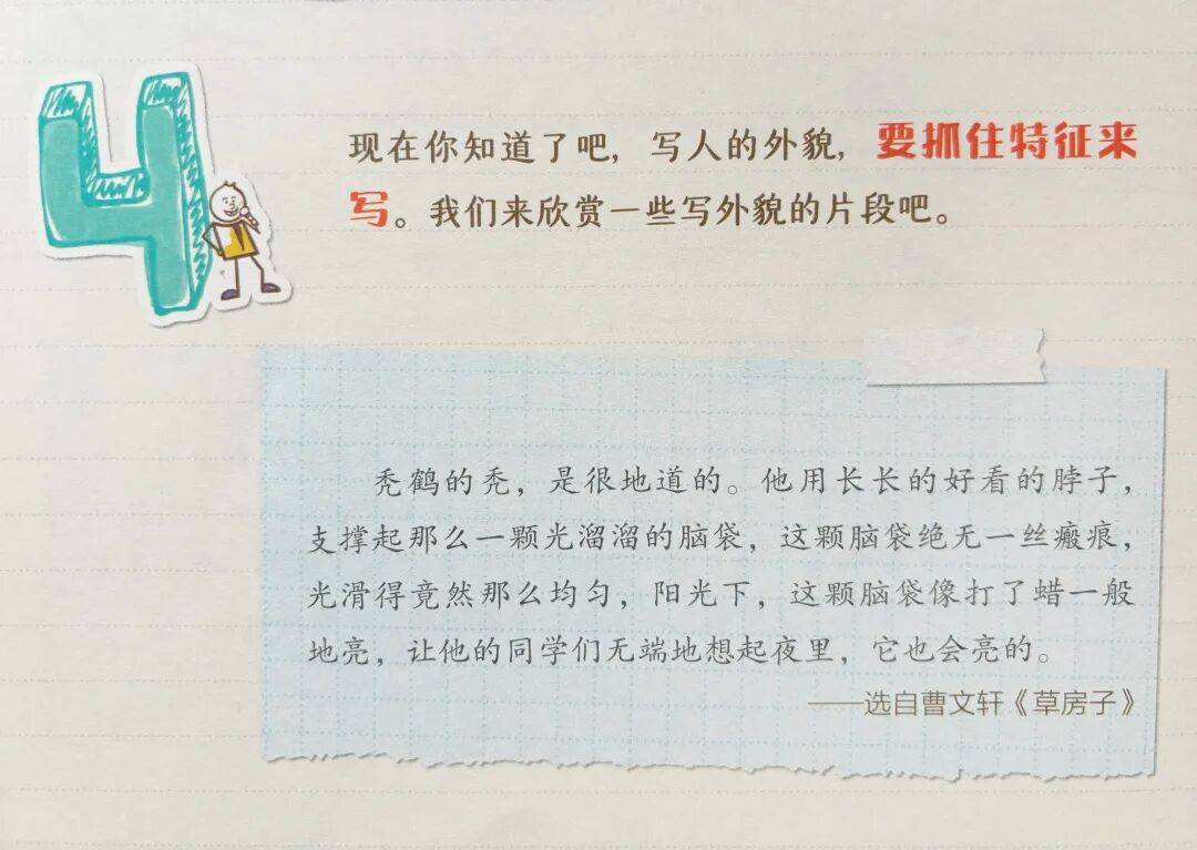 第四步:总结一下,原来写人的外貌需要抓住特征。那么我们举一反三一下,之前阅读过的书里,写人物特征的片段拿来读读。
