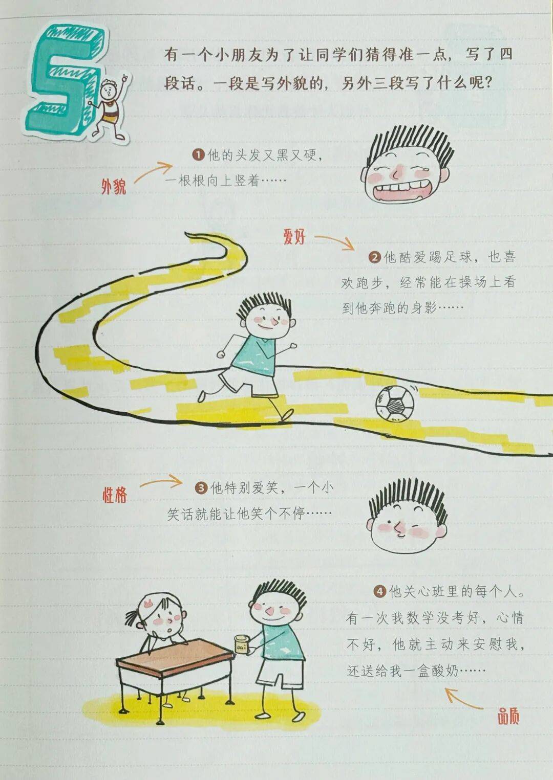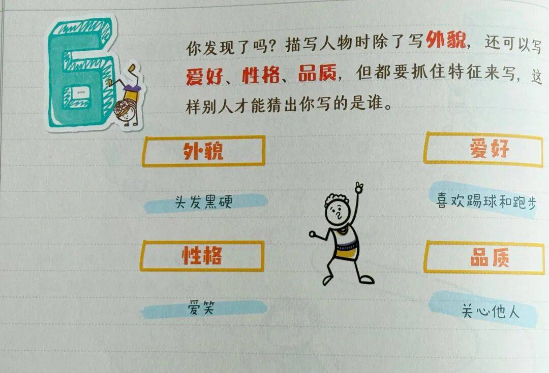 第六步:再来总结一下,写人物,除了写外貌,还能写爱好、性格、品质。当然啦,孩子一开始不需要面面俱到,那么就可以提示孩子,先想一个人,然后在这四个方面选择两点写。