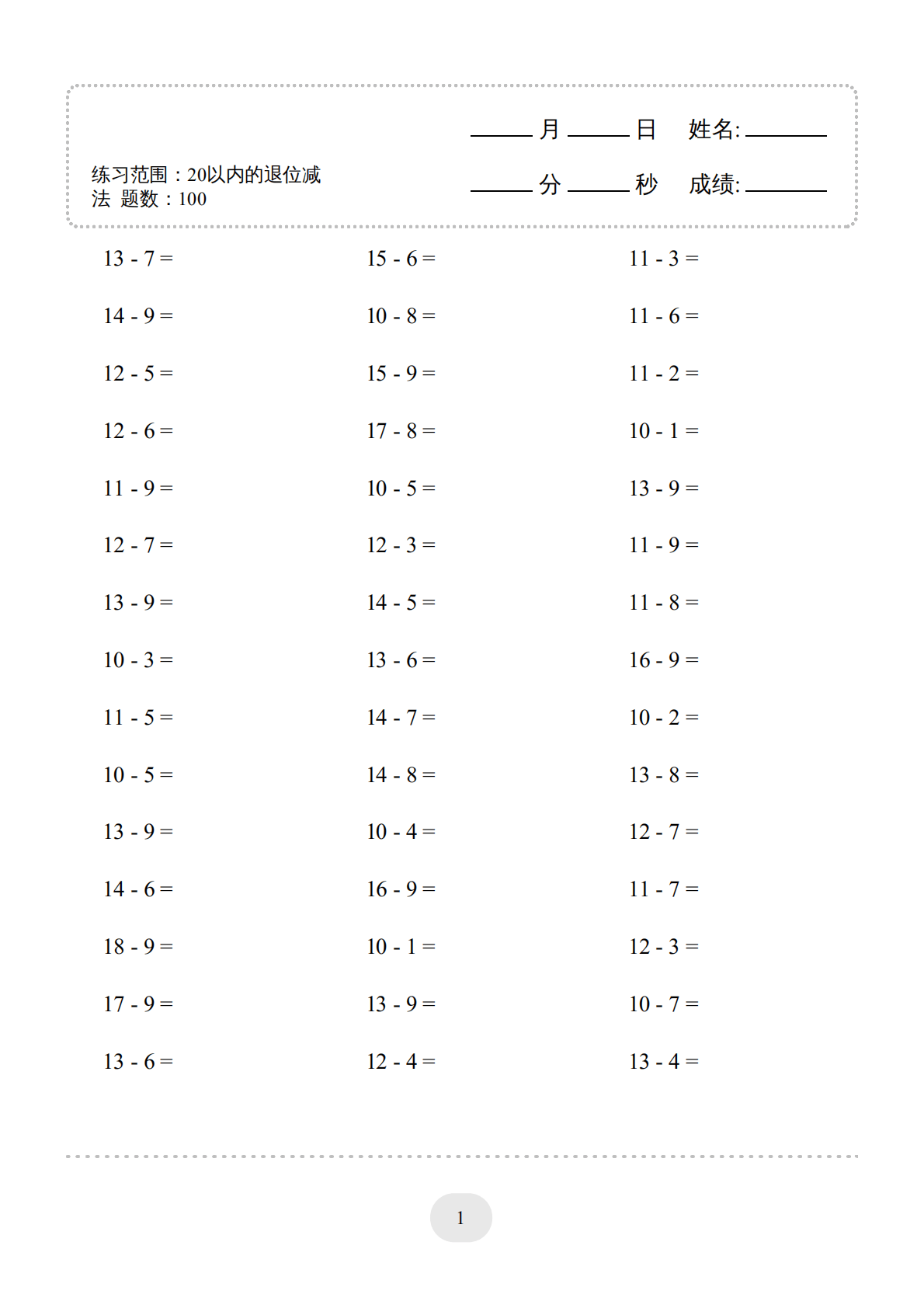 题量充足,覆盖面广:整整30页的打印版资源,包含了足足1500道20以内的退位减法练习题。像13-7、15-6、11-3这种孩子最容易卡壳的经典题型全都有,完全能满足日常磨耳朵和练手感的需求。