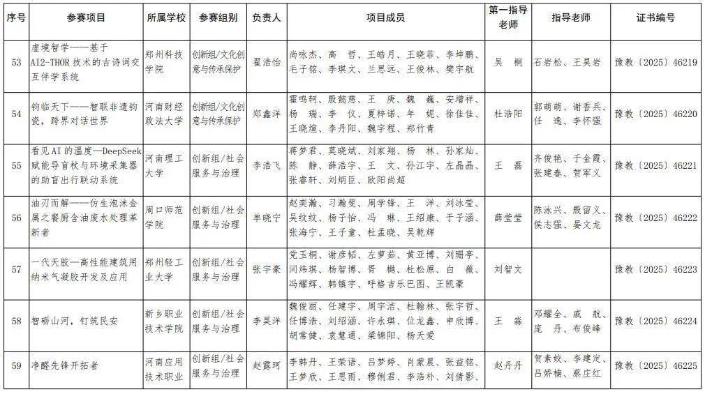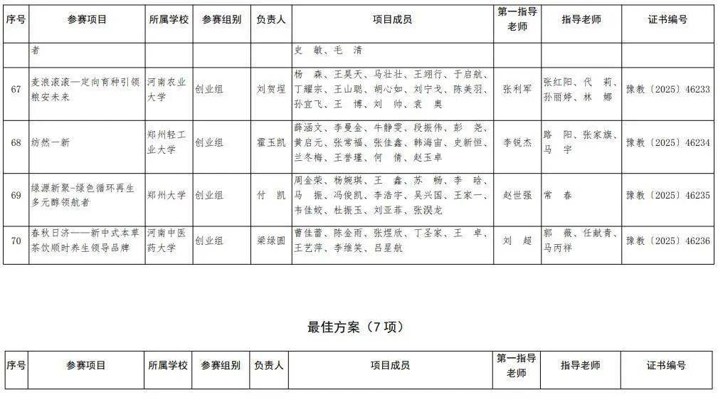 为一体推进教育科技人才发展,培养打造一支“敢创会创”的青年人才队伍,搭建产学研一体化创新创业平台,推动青年人才成为创业创新创造主力军,省委组织部(省委人才办)、省教育厅、省人力资源社会保障厅举办了河南省“豫你携手·创赢未来”大学生创新创业大赛。经学校推荐、网络评审、现场评审,最终确定金奖16项、银奖36项、铜奖70项、“最佳方案”7项,现予公布。