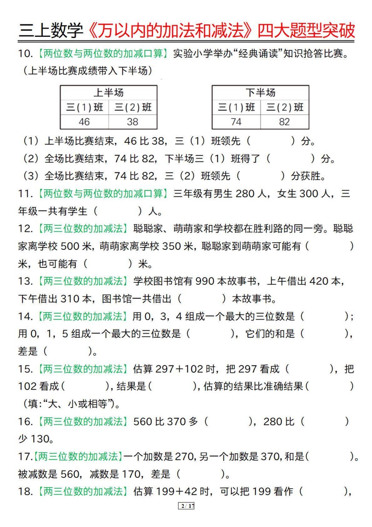 填空题的专项训练能强化学生对加减运算算理的理解,巩固计算技能,同时结合单位换算、实际场景的题目,提升知识的综合应用能力;其次,判断题能帮助学生辨析加减运算中的常见错误认知,理清概念边界,减少解题中的逻辑失误;整体的题型突破练习,既覆盖了单元知识的重点与易错点,也能让学生熟悉不同题型的解题思路,提升对 “万以内加减法” 知识的掌握程度,为后续复杂运算和应用奠定基础。