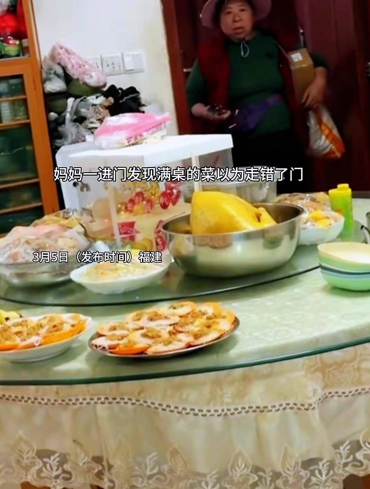就像这位母亲一样,她过生日的那一天,女儿偷偷跑回家做了一桌子饭菜,打算给她个惊喜。妈妈干活回到家以后自己进错了门,退出去再三确认后,表情亮了。