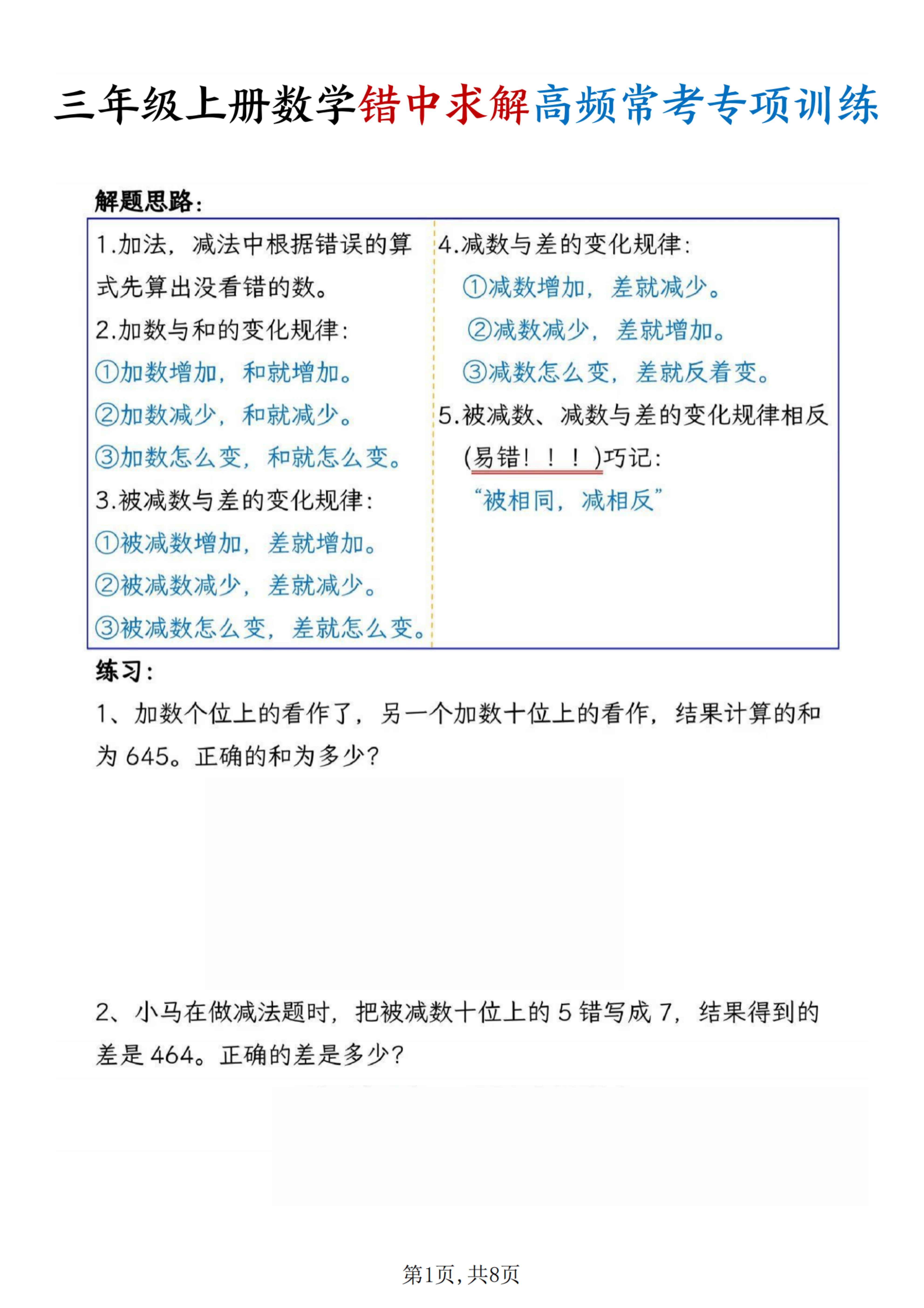 今天给大家分享:三年级数学里,“错中求解” 是期末必考的 “拉分题”明明会算加减,却总在 “看错数字” 的陷阱里栽跟头:把个位 4 看成 8、十位 3 看成 6,算出的和差全不对,看着干着急。其实这类题根本不用重新列算式,只要抓住 “加数 / 被减数 / 减数的变化规律”,30 秒就能算出正确结果,连学渣都能秒懂!
