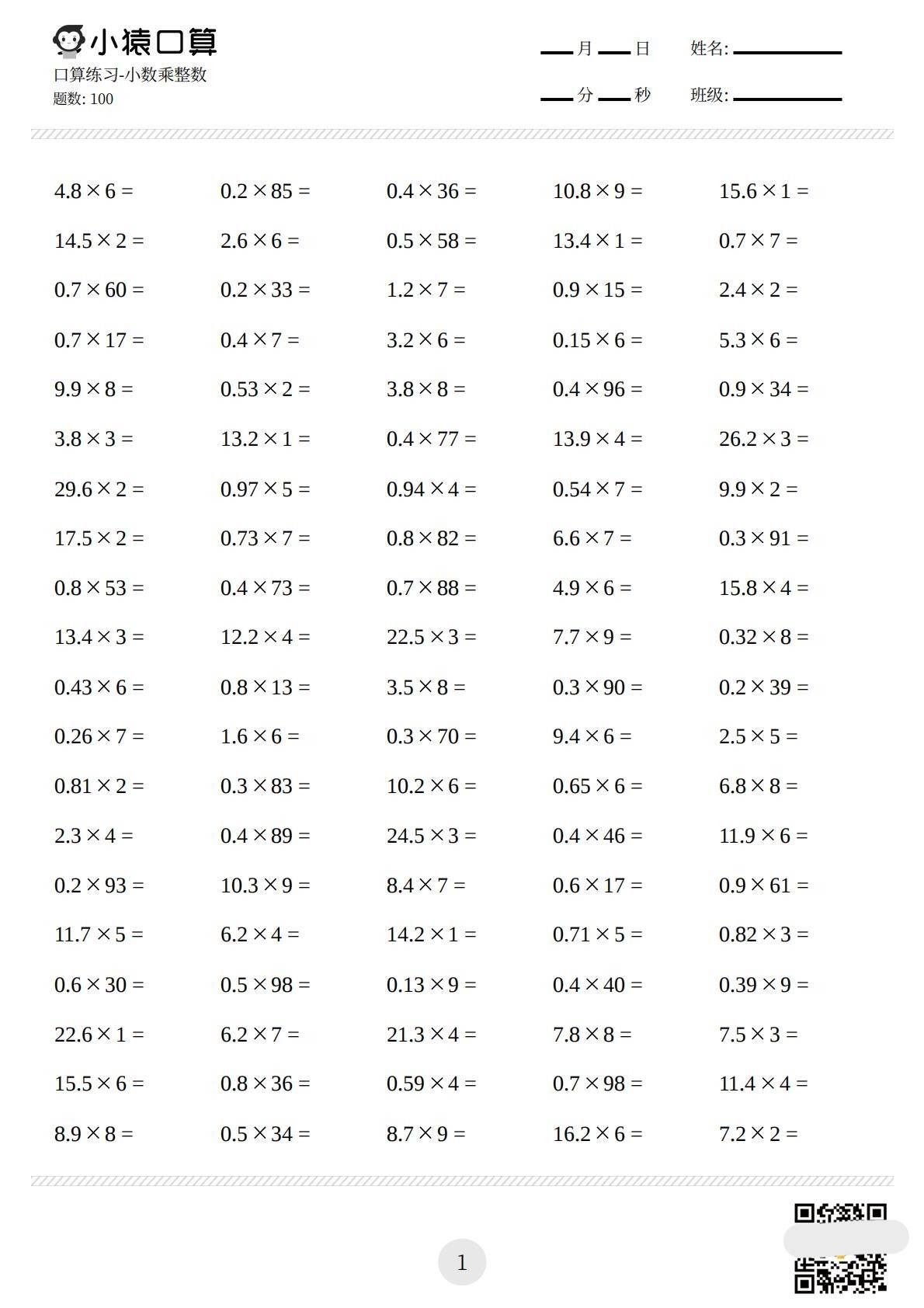 今天为大家分享:五年级口算练习题(小数乘整数等,共800题18页)。内容涵盖小数乘法的三类核心训练:一是小数乘整数的口算(如 4.8×6),二是小数乘小数的口算(如 0.23×0.9),三是小数乘法运算定律的应用(如乘法分配律的简便计算),每套题量为 100 题,搭配时间、成绩记录栏。