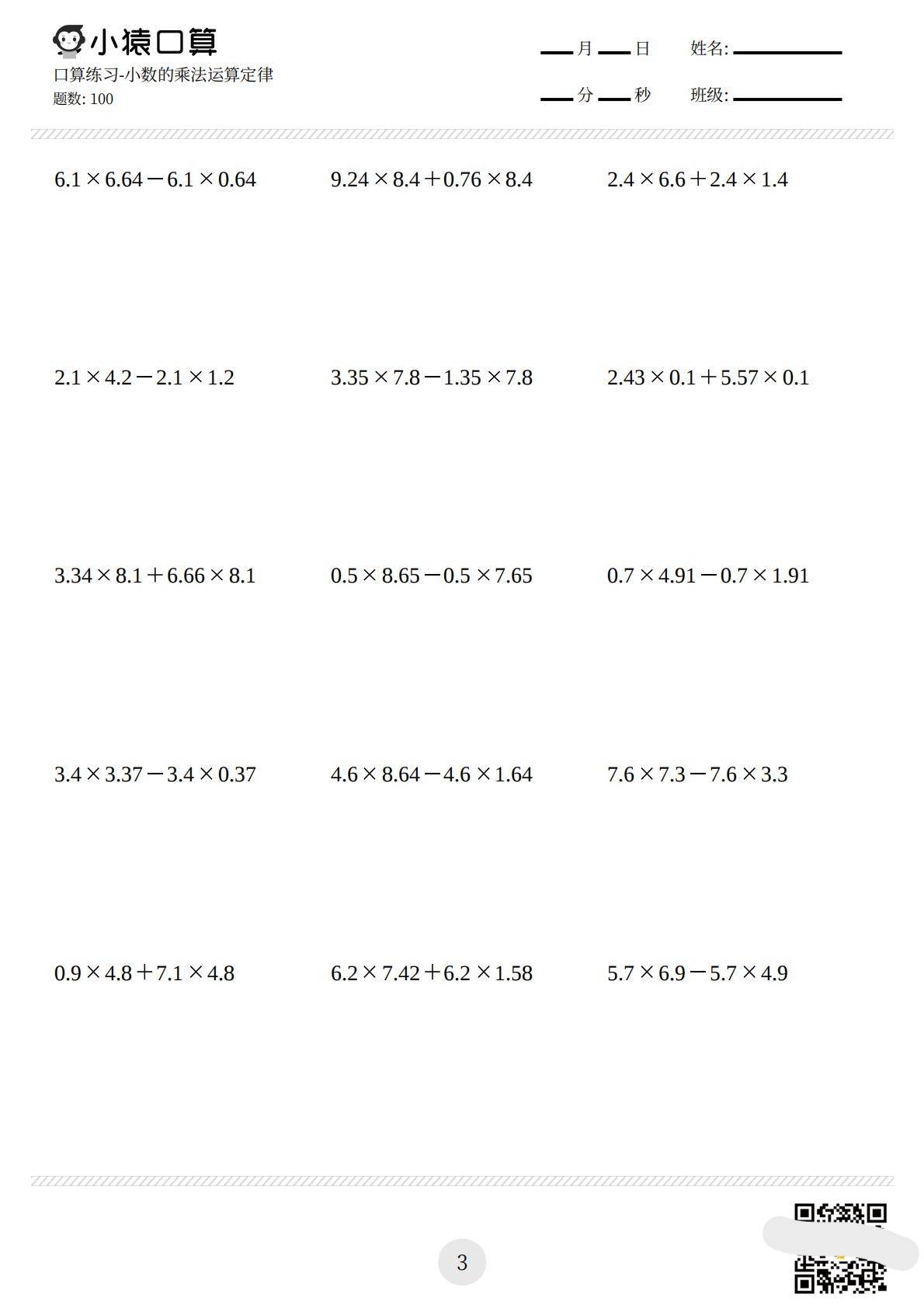 这些练习是运算能力的巩固工具,它通过大量集中的口算训练,帮助学生熟练小数乘法的计算步骤(如小数点的定位),提升计算速度与准确性;尤其是运算定律的应用练习,能让学生掌握简便计算的方法,避免复杂运算的错误,同时通过限时练习,培养运算的专注力与效率。