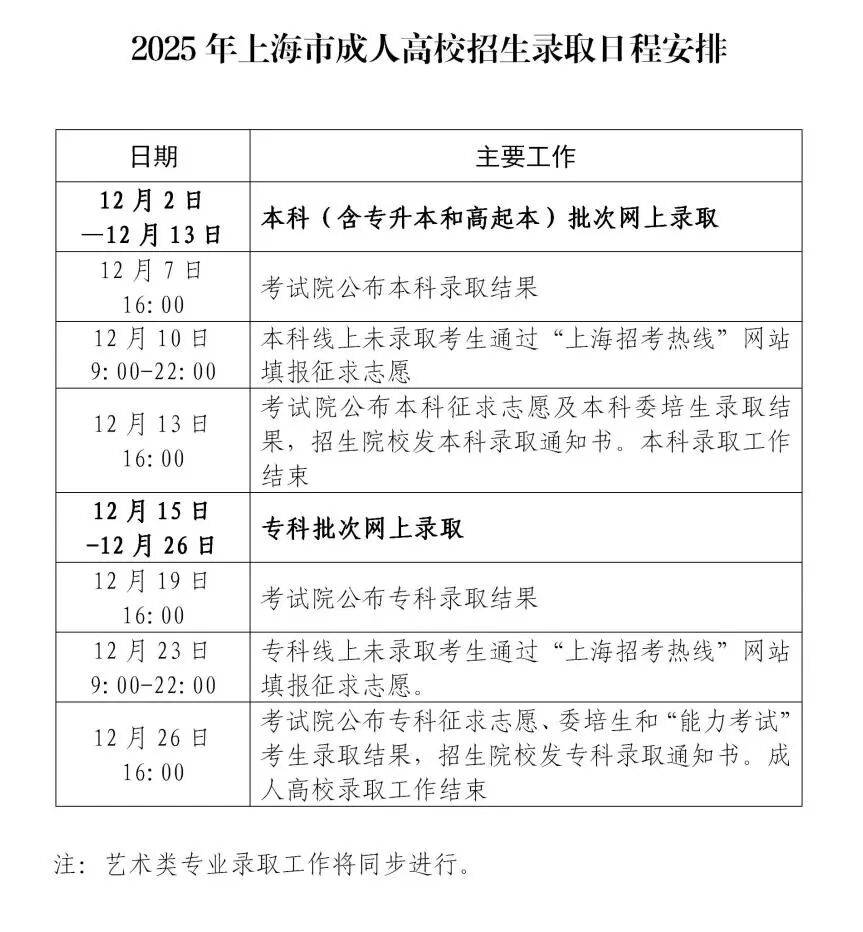 市教育考试院介绍,2025年上海市成人高校招生录取工作将于2025年12月2日至2025年12月26日进行。录取将分为两个批次三个层次进行:本科批次(含高中起点升本科、专科起点升本科层次)和专科批次(高中起点升专科层次)。考生可根据录取日程安排(详见下方),及时查询录取结果和了解征求志愿等信息。录取日程安排详见↓