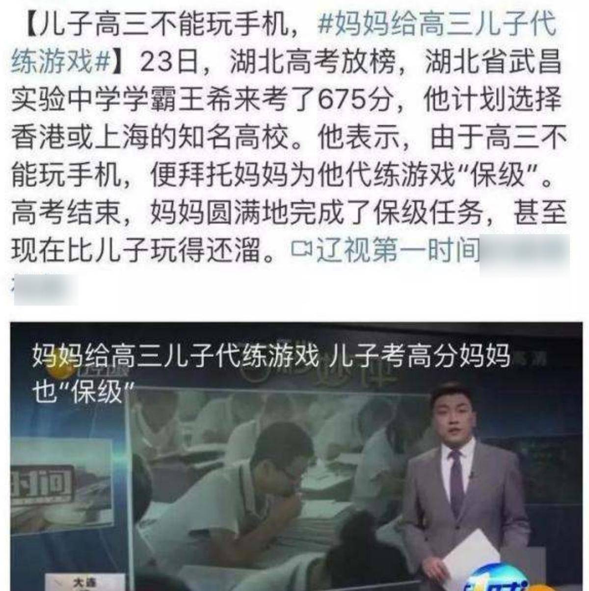 看过一则新闻,儿子上高三了,学习紧张不能玩手机了,就拜托妈妈帮忙代练游戏“保级”,结果妈妈圆满完成保级任务,比儿子玩得还溜。儿子也考出了675分的高分,计划选香港或上海的名校。