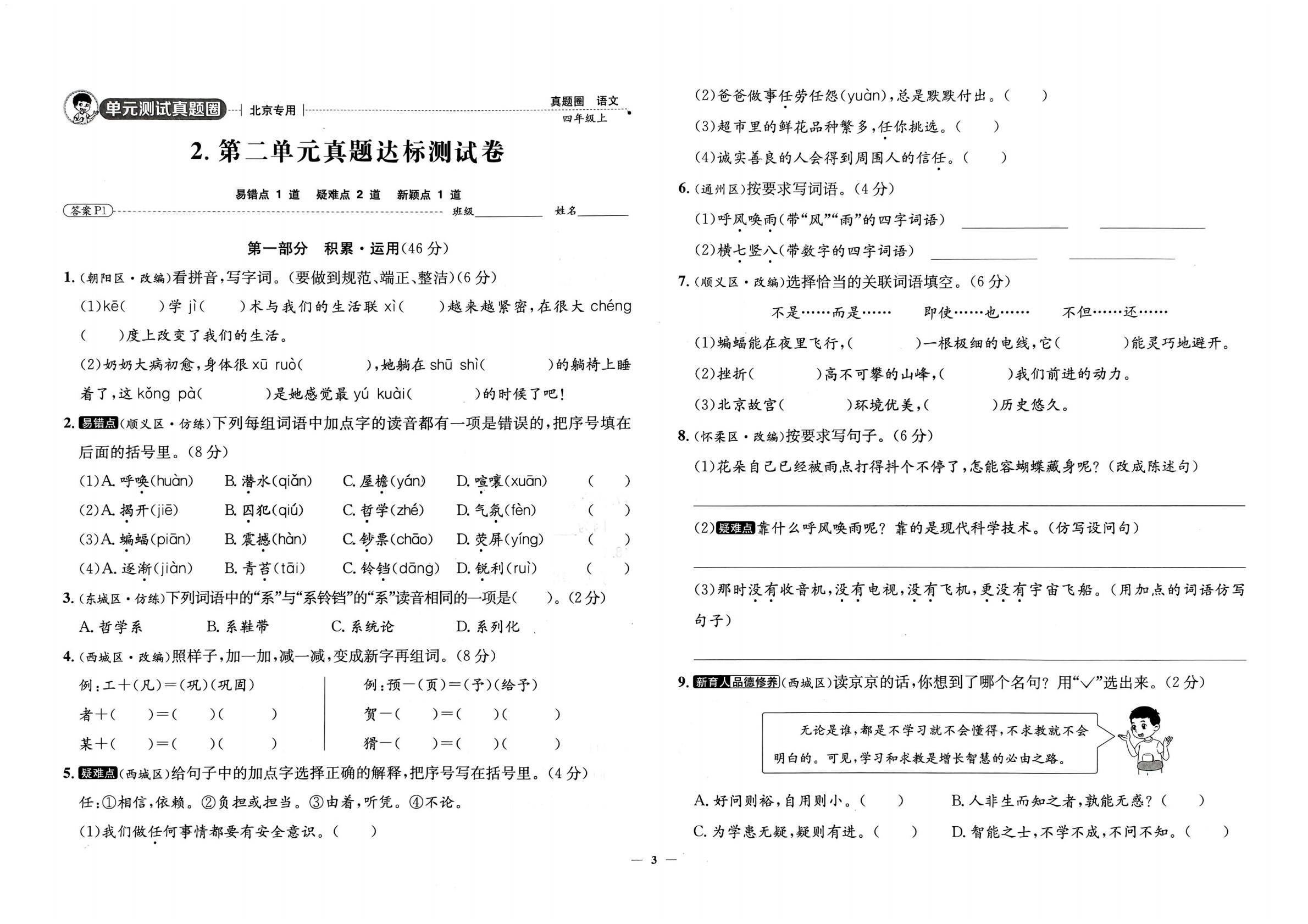 今天为大家分享:2025秋北京真题圈四上语文,包含两部分内容:一是单元知识思维导图,涵盖 1-8 单元的字音、多音字、字形、词语及积累内容(如古诗、名言),同时标注了易错题及误区解析;二是单元真题达标测试卷,包含积累・运用、阅读・感悟、表达・交流三个板块,题目选自北京各区的真题,涉及看拼音写词语、字词辨析、阅读分析、写作等题型。