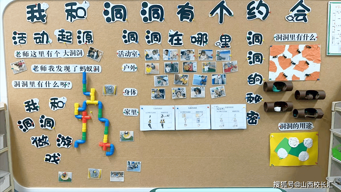 活动之初,孩子们的目光便被身边的“洞洞”牢牢吸引。活动室里玩具上的小孔、户外操场的排水洞、小区里的树洞与井盖,甚至自己身体上的“五官洞”,都成了探索的对象。在老师的引导下,孩子们带着“洞洞发现记录表”,和家长一起开启“家庭洞洞大搜索”,从衣架的挂钩洞到洗手池的排水洞,用照片、绘画记录洞洞的模样与用途,第二天在班级分享时,一个个鲜活的发现让主题墙“洞洞在哪里”板块迅速丰富起来。