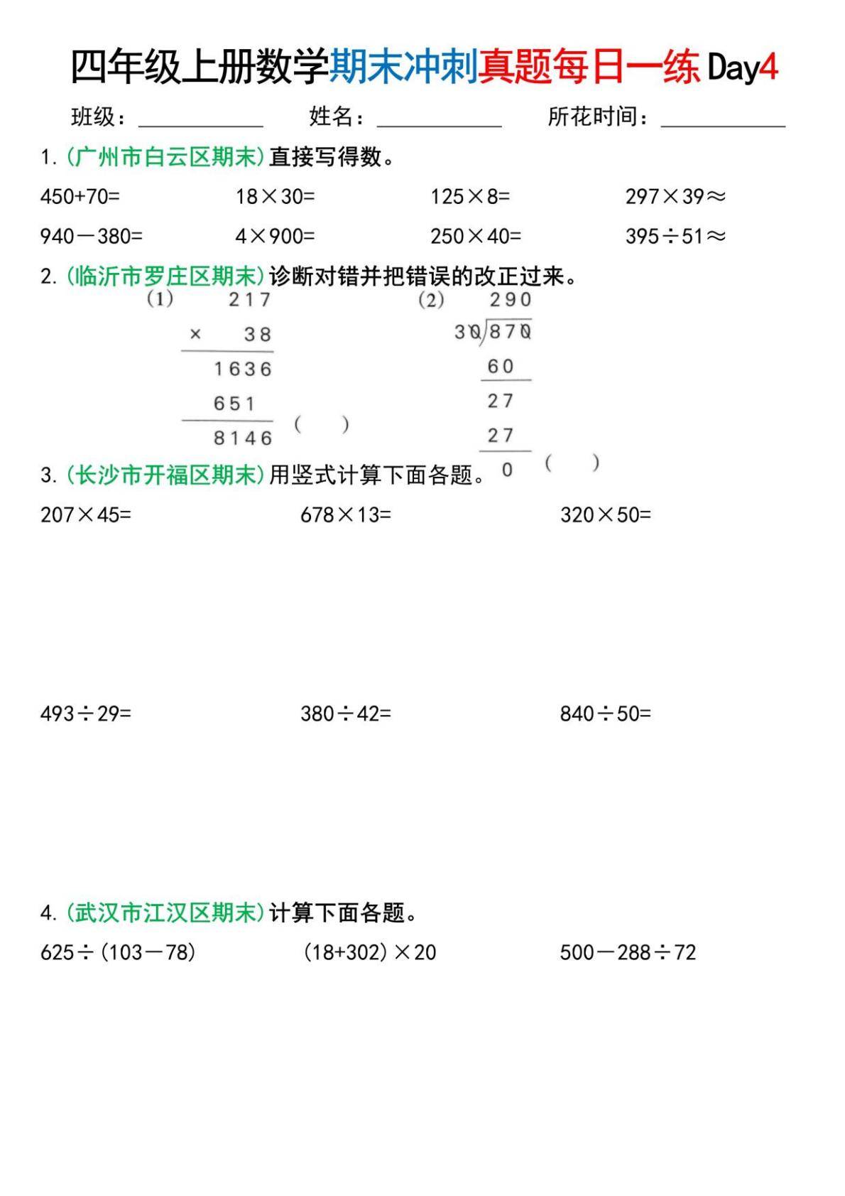 对于学生的学习,这份资料的帮助较为实际:首先,它以期末真题为载体,能让学生熟悉不同地区的考试题型,明确计算模块的常考形式,多样的计算练习能巩固学生的运算能力,提升乘除法计算的准确性与熟练度,同时强化对运算顺序、验算方法的掌握;余数、商的位数等细节题型,能帮助学生关注计算中的易错点,减少考试中的细节错误;“每日一练” 的形式便于学生分阶段练习,逐步提升计算能力,同时通过真题练习了解自身的薄弱环节,进行针对性巩固。整体而言,这份材料贴合四年级数学期末复习的需求,是提升计算能力、熟悉考试题型的实用练习工具。