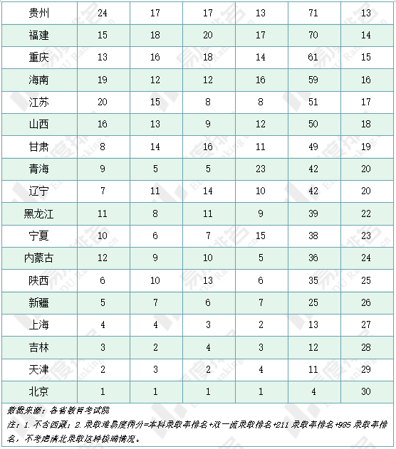 北京、天津、上海等省市在各项排名中持续稳居全国最宽松行列,综合难度得分最低,考生面临的整体压力远小于其他省份。