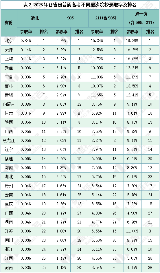 北京双一流及以上院校录取率均为全国第一,拥有较大的优势。新疆、宁夏、青海等省份排名也相对靠前,甚至超过了许多东部教育强省。这在一定程度上能看出国家招生政策对中西部和边疆地区的倾斜与扶持,使得这些地区的考生在争取顶尖资源时拥有更宽松的通道。