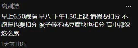 有些大学生连早八都不是,学生们被强行要求六点半起来跑早操被子还要叠成豆腐块。天天如此,让人禁不住怀疑自己是不是读了个假大学?