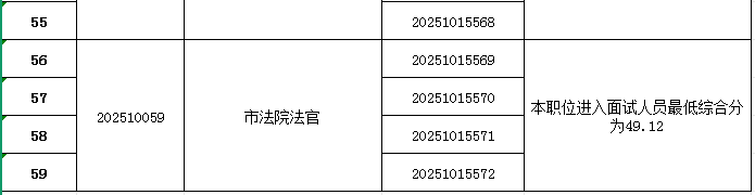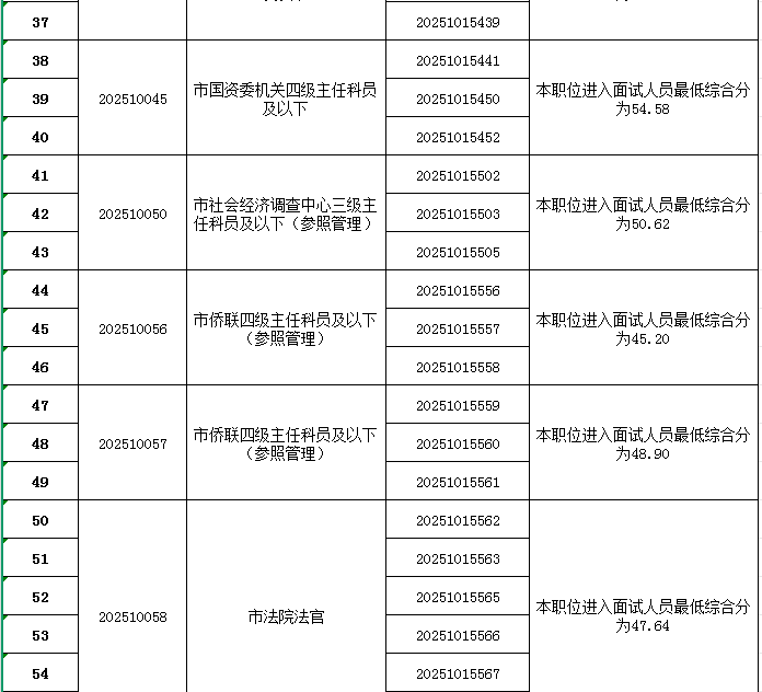 对于取得面试有效成绩的人数少于等于规定进入考察人数的职位,如出现1人参加面试的,考生面试成绩应达到下列面试合格分数线之一,方可进入考察;有2人及以上参加面试的,综合成绩排名末位的考生面试成绩应达到下列面试合格分数线之一的,方可进入考察: