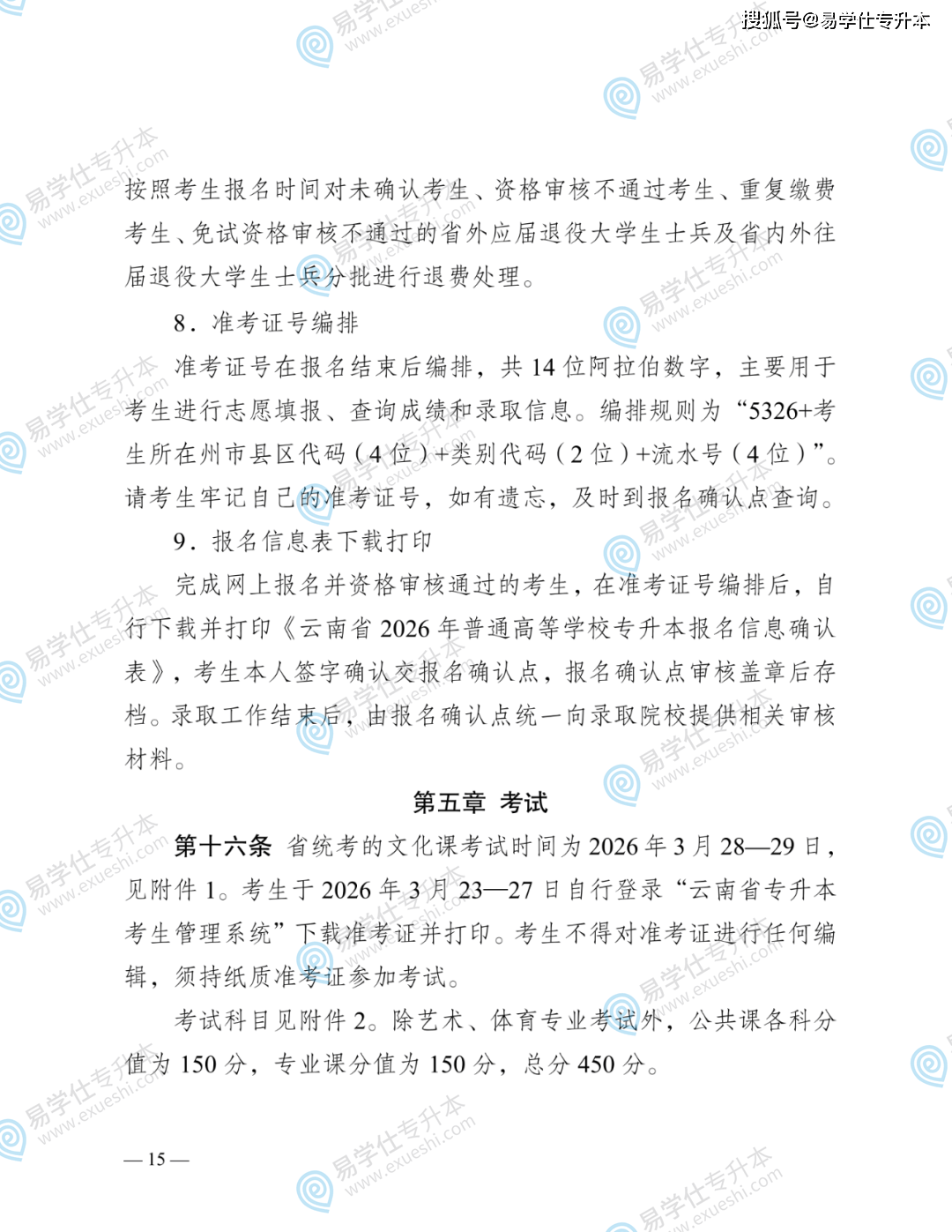 云南省2026年普通高等学校专升本统一考试招生工作办法