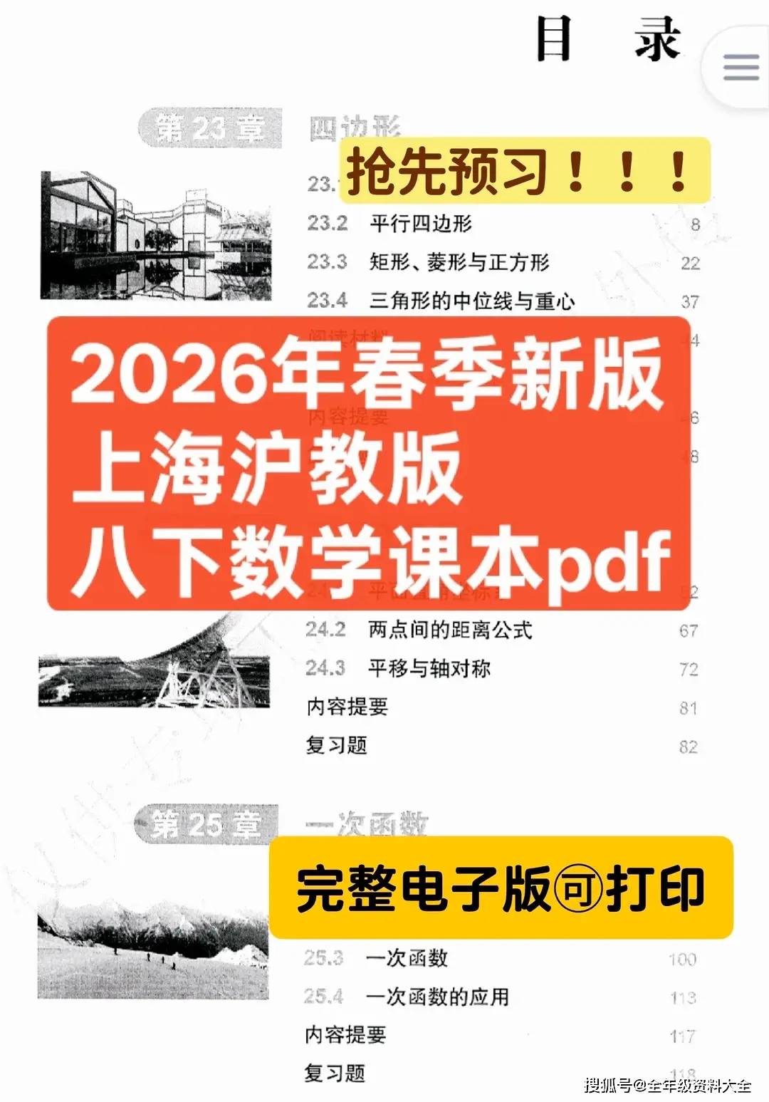 2026 上海沪教版八年级下册数学课本也太会 “把几何 + 函数揉进实用场景” 了吧!这课本把 “四边形(多边形、平行四边形)、平面直角坐标系、一次函数、反比例函数” 这些核心知识,全装进 “生活场景” 的框架里 —— 从 “建筑设计里的多边形结构” 学内角和计算,到 “商场促销中的一次函数定价” 练应用,连看似抽象的 “三角形中位线”,都和 “平行四边形性质” 绑着在 “社区花园规划” 场景里学,每章还配套 “数学阅读材料(比如‘函数在交通流量中的应用’)+ 综合实践任务(比如‘用坐标系设计校园平面图’)”,就像给数学学习装了 “场景放大镜”,让枯燥的公式定理全有了生活落脚点~