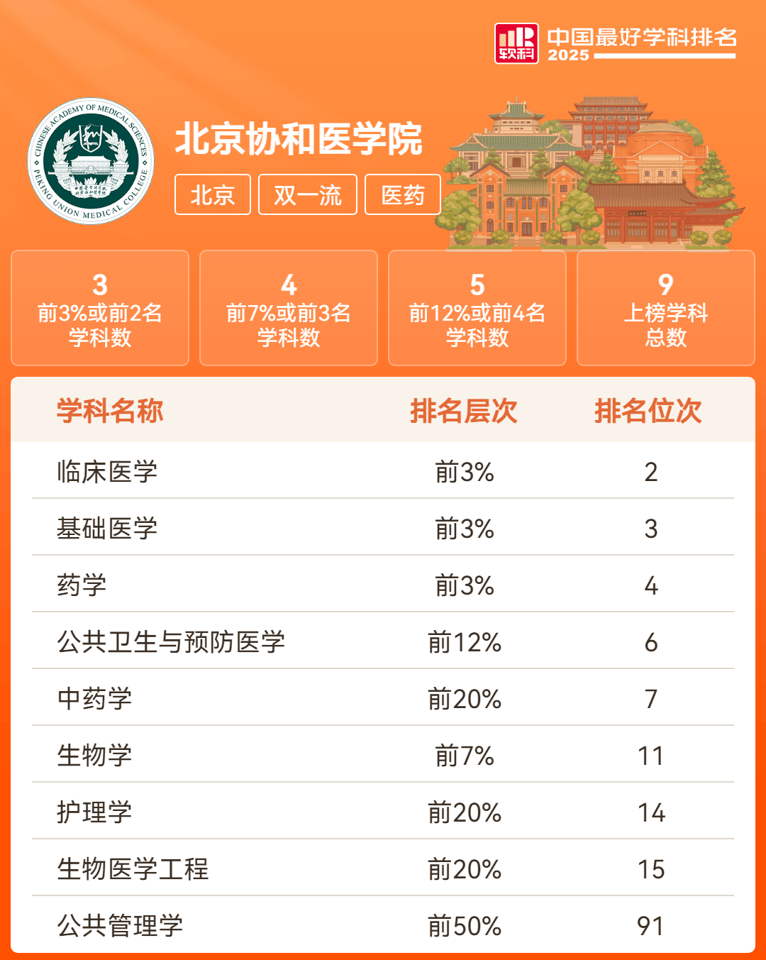 学校学科实力不斐,临床医学(全国第2名)、基础医学(全国第3名)、药学(全国第4名)在2025软科中国最好学科排名中跻身国内前3%行列。医学泰斗辈出,培养了包括张孝骞、张锡钧、钟惠澜、林巧稚等在内的超50位医药卫生领域院士。科研硕果累累,潘湘斌团队牵头的项目荣获2023年度国家技术发明奖二等奖,王健伟团队、李琦涵团队牵头的2个项目荣获2023年度国家科学技术进步奖二等奖。进入新百年,学校贯彻落实习近平总书记“建设成为我国医学科技创新体系的核心基地”的指示精神,致力于成为国家医学研究和教育事业的强劲动力源!