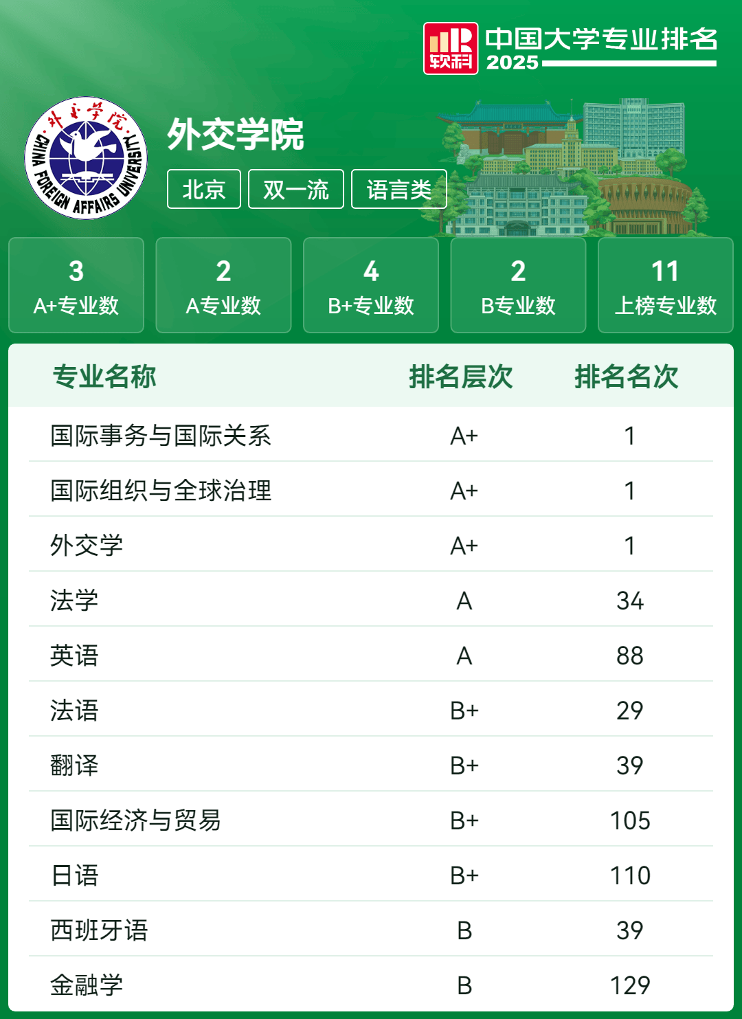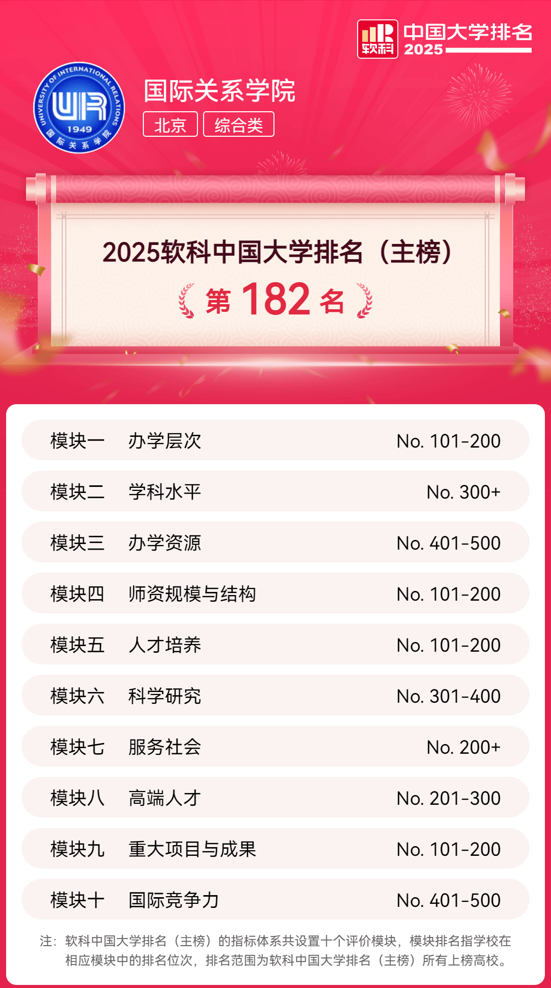 国际关系学院是教育部直属高校,以国家安全和国际安全等重点学科专业特色著称,是我国知名国际关系和国际安全学者培育的“摇篮”。2025年,国际关系学院是唯一一所跻身软科中国大学排名主榜200强的“学院”。