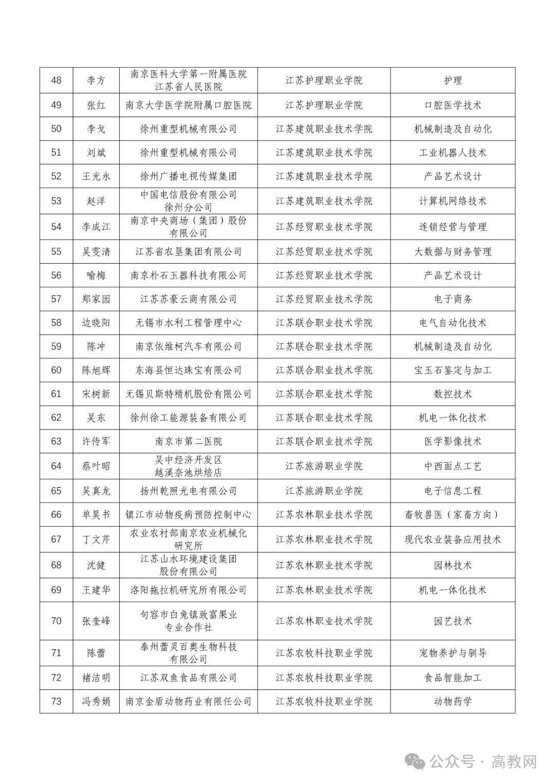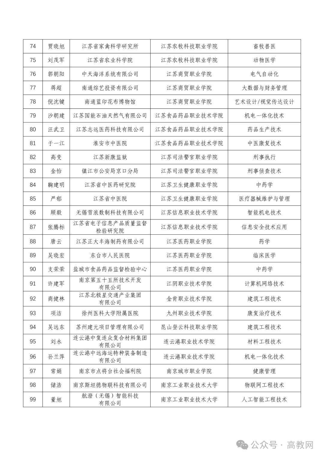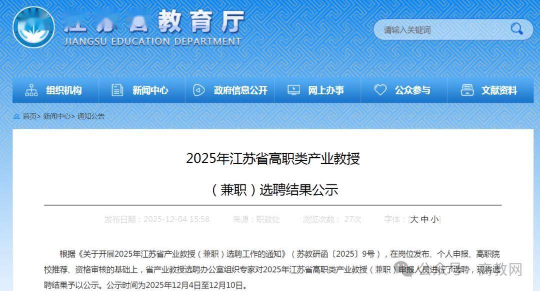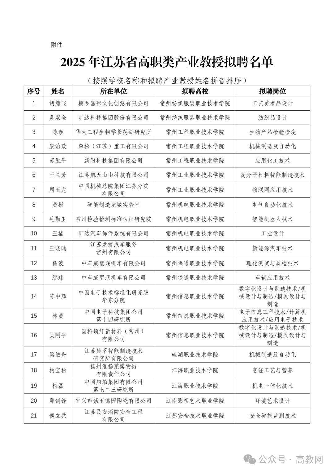 高教网讯 12月4日,江苏省省产业教授选聘办公室发布了2025年江苏省高职类产业教授(兼职)选聘结果公示信息。在岗位发布、个人申报、高职院校推荐、资格审核的基础上,江苏省省产业教授选聘办公室组织专家对2025年江苏省高职类产业教授(兼职)申报人员进行了选聘,共200人入选。