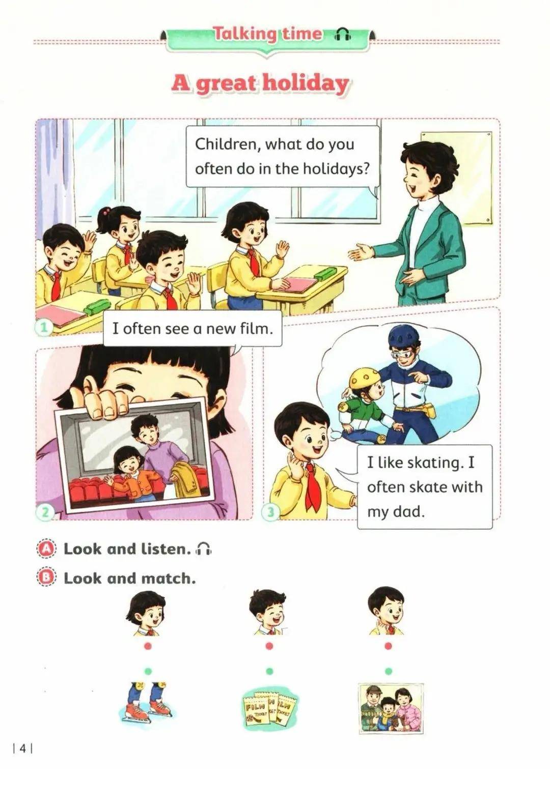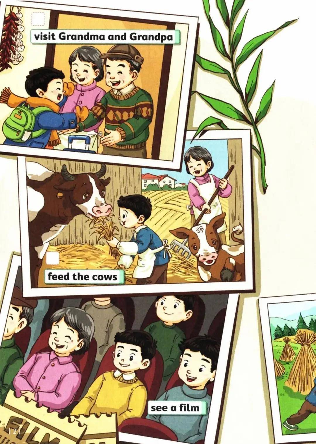 二年级正是英语 “兴趣培养 + 基础奠基” 的关键期,很多娃卡在 “词汇记不住、句型不会说、学英语没兴趣”,这份教材把 “低龄适配 + 能力落地” 踩得巨准:内容完全贴合二年级娃的生活认知,假期出游、帮妈妈做家务、跟朋友分享心情都是日常熟悉的场景,比如学 “假期活动” 时,用娃去过的农场、电影院做素材,记 “feed cows”“watch a film” 时能联想到自己的经历;按 “场景认词→儿歌记句→任务实践” 的节奏设计 —— 先通过 “看图片认词汇”(如指着奶牛图片学 “cow”),再用 “韵律儿歌” 把词汇和句型串起来(如 “Holiday, holiday, I went to the farm. Feed cows, feed cows, it’s so fun!”),最后完成 “迷你项目”(如用贴纸拼贴 “我的假期相册”,并说 “I went to the farm. I fed cows.”),完美适配 “从玩中学、建立英语信心” 的低龄学习需求。