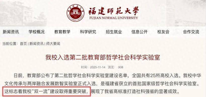 “学校的‘中华文化传承与两岸融合发展数智实验室’正式入选第二批教育部哲学社会科学实验室,这标志着我校双一流建设取得重要突破。”2025年11月,福建师范大学在官网上高调官宣。