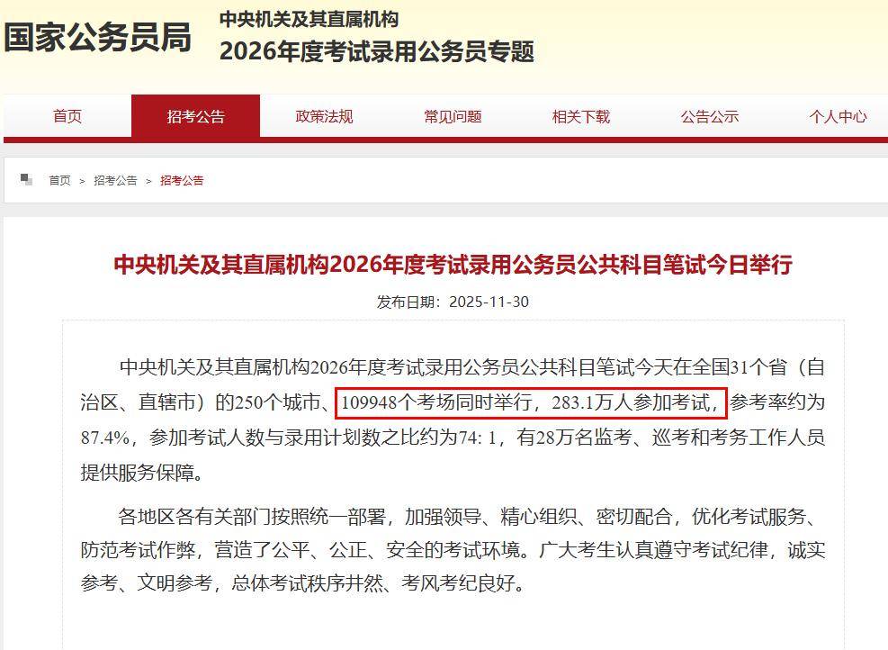 2026年度考试录用公务员公共科目笔试参加人数高达283.1万人
