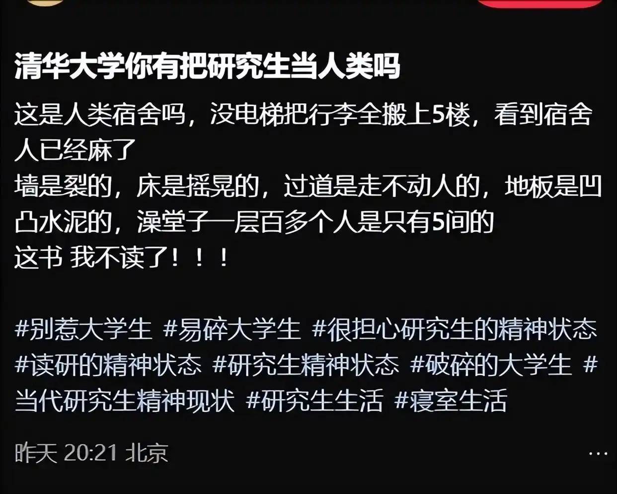 清华的基础建设还是很好的,这样老旧的宿舍楼,寥寥无几,就这么被他“摊上了”。发发牢骚,也正常。真的不读了,才是可惜的。