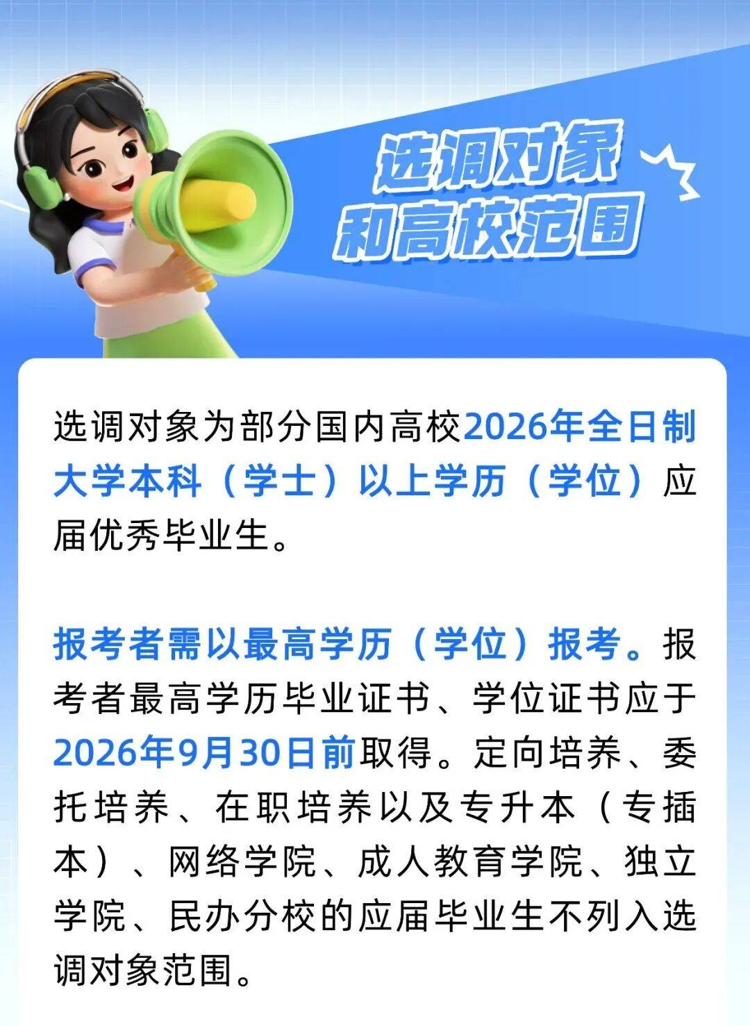 选调对象为部分国内高校2026年全日制大学本科(学士)以上学历(学位)应届优秀毕业生。选调高校范围见附件2。