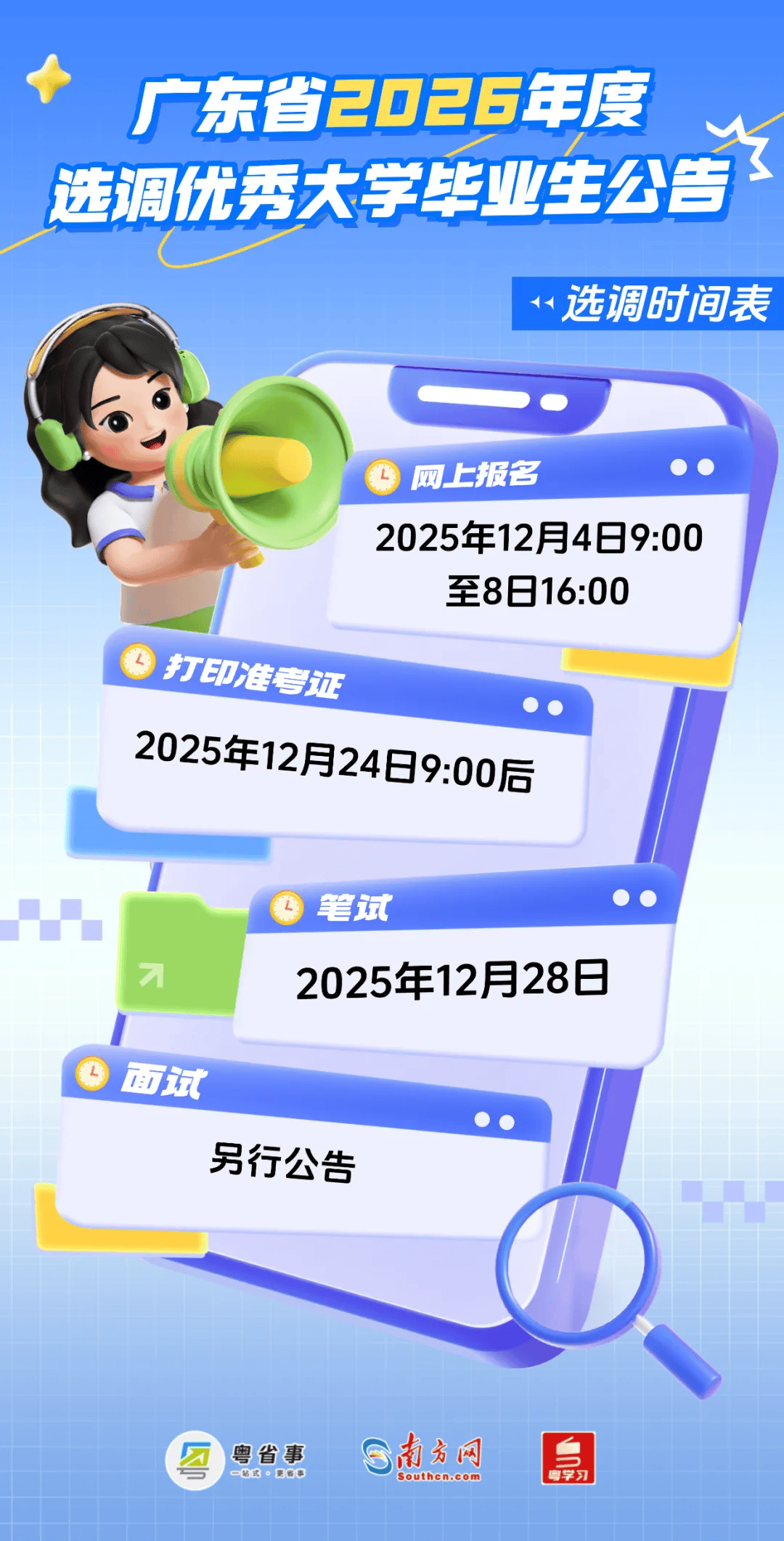 全省共计划选调应届优秀大学毕业生1715名,报考者可通过广东组织工作网(https://www.gdzz.gov.cn)、广东省人力资源和社会保障厅网(http://hrss.gd.gov.cn)、广东人事考试网(http://rsks.gd.gov.cn)或“粤省事”“广东发布”“粤讲粤政”等微信公众号查阅具体的招考单位、职位、人数和报考资格条件。