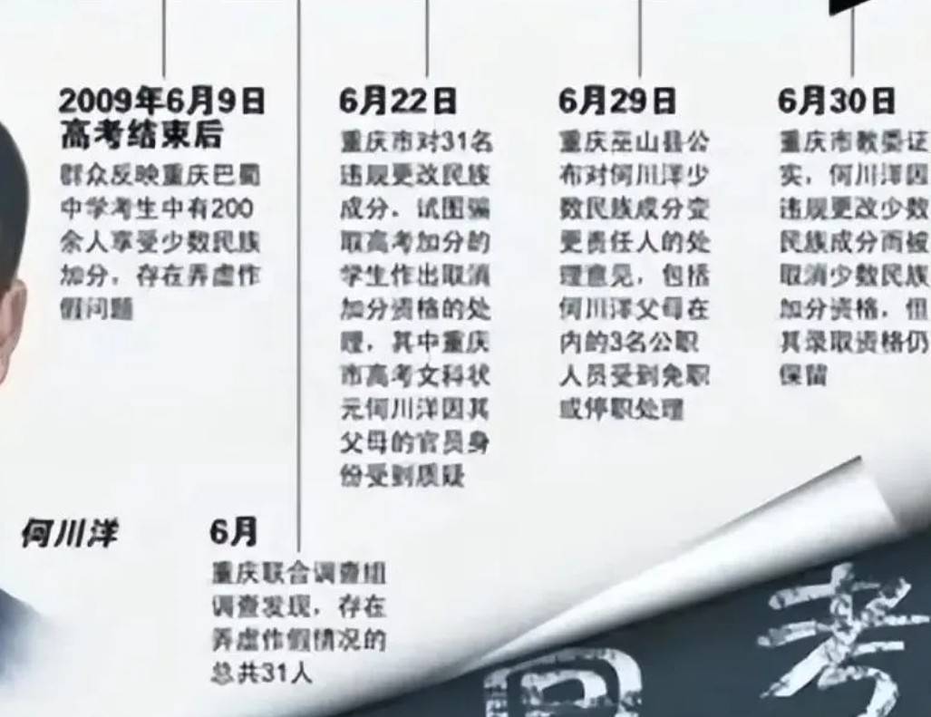 何川阳的父母并非高级官员,也不是富豪,但他们都是政府公职人员——父亲是巫山县招生办主任,母亲是县委组织部的领导。自小,他们对儿子的教育十分重视,视儿子为家族的骄傲。何川阳从小就表现出色,他的父亲还通过四大名著的连环画,培养了他的阅读兴趣,这为他后来选择文科打下了基础。何川阳也并非偏科,课外时间参加了多个补习班,远超同龄人。 因为儿子的优秀,何川阳的父母自然对他寄予厚望,甚至不惜为他创造一切有利条件。父亲作为招生系统的从业人员,也曾看到了高考加分政策的漏洞。尽管他们一家是汉族,但何川阳的祖籍是土家族所在的巫山县,凭此,父亲通过妹妹收集相关证明材料,在何川阳读初三时将其民族改为了土家族。这一操作成功让何川阳获得了20分的少数民族加分,进而成为了2009年重庆的文科状元。