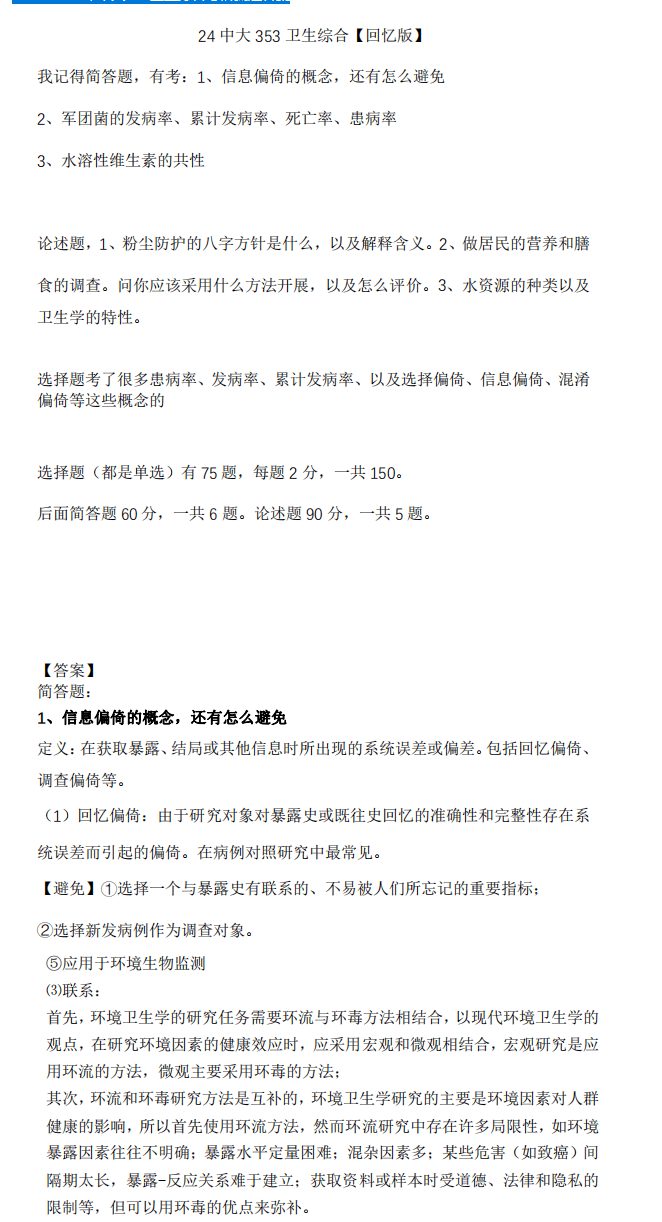 2010-2024年中大353卫生综合考研真题答案