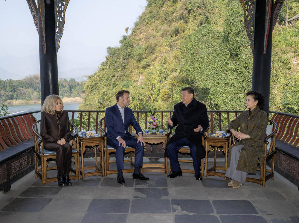 12月5日,国家主席习近平在四川省成都市都江堰同法国总统马克龙进行友好交流。这是两国元首夫妇落座怀古亭,临水品茗,纵论天下。新华社记者 翟健岚 摄